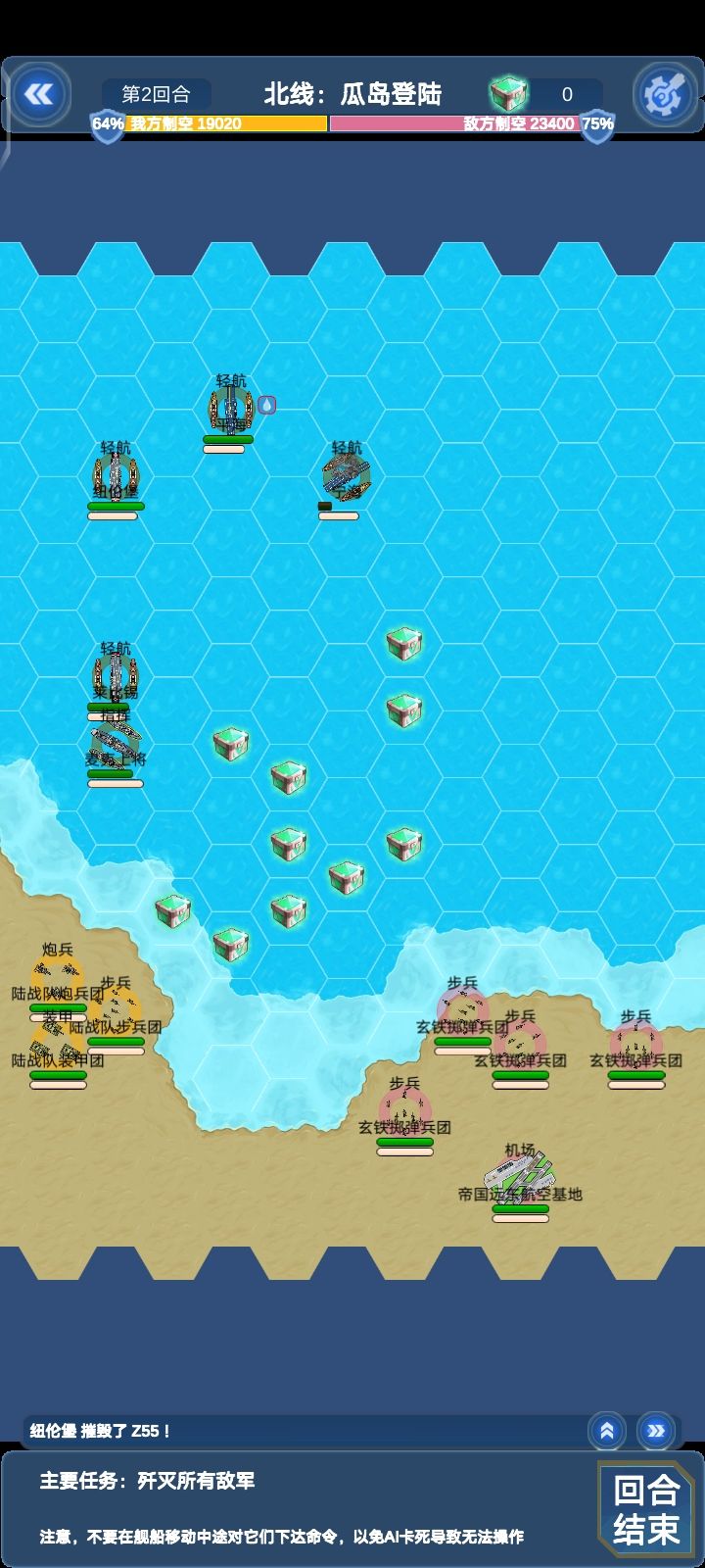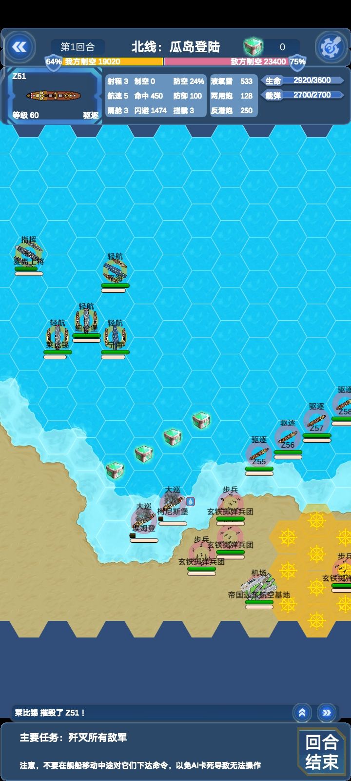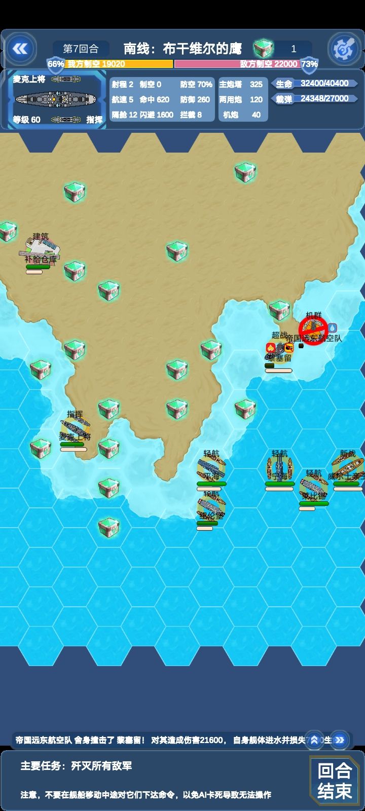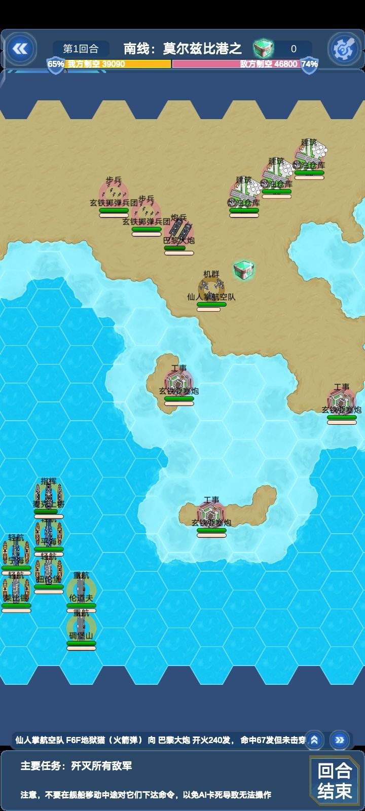 这边所有单位对我方航母威胁不大,威尔士亲王除外(会被对面要塞秒)本关陆地单位较多,建议上对陆比较强的船(比如说纽伦堡和莱比锡)