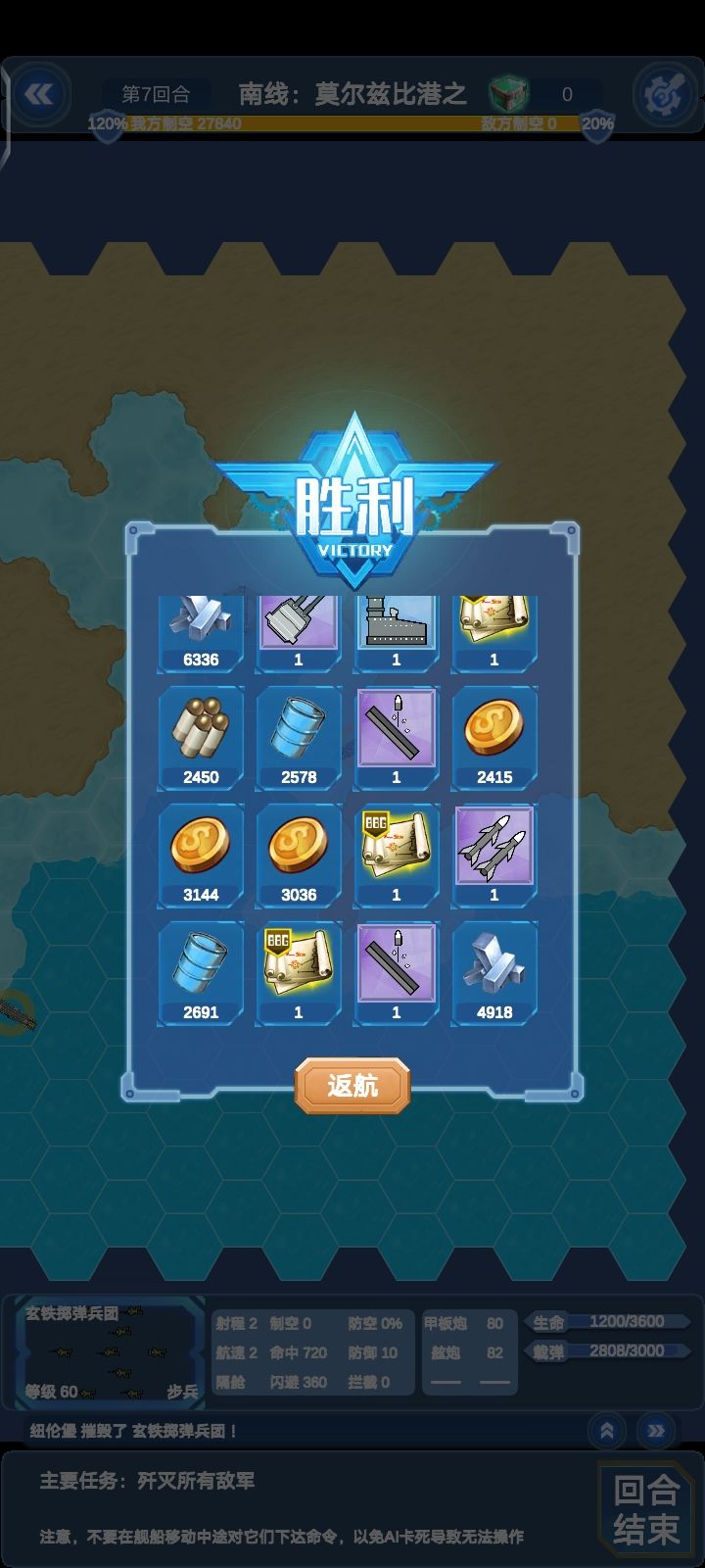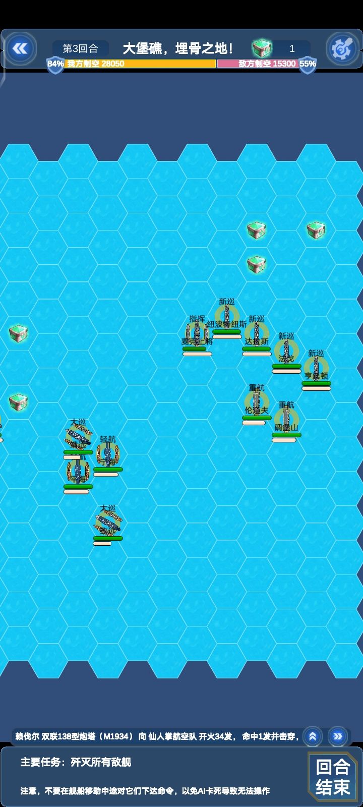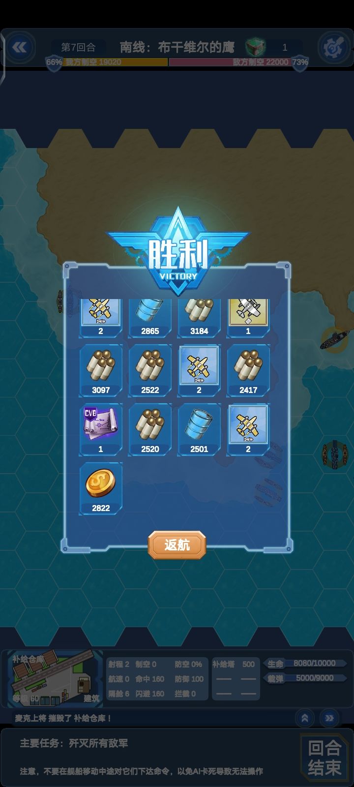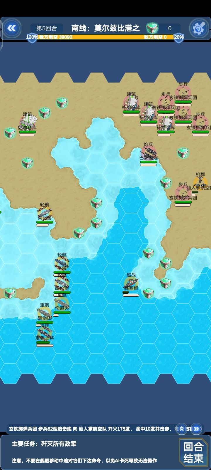这边所有单位对我方航母威胁不大,威尔士亲王除外(会被对面要塞秒)本关陆地单位较多,建议上对陆比较强的船(比如说纽伦堡和莱比锡)