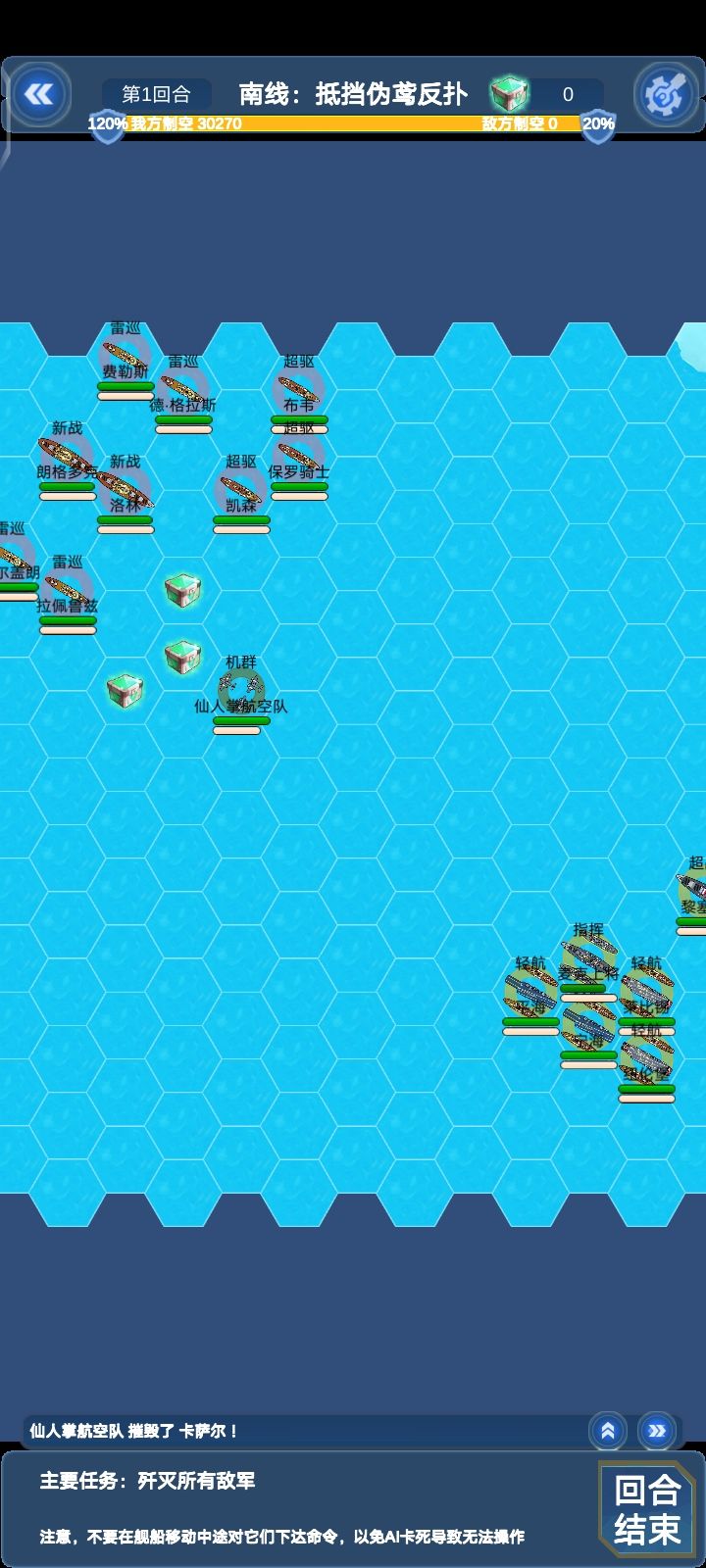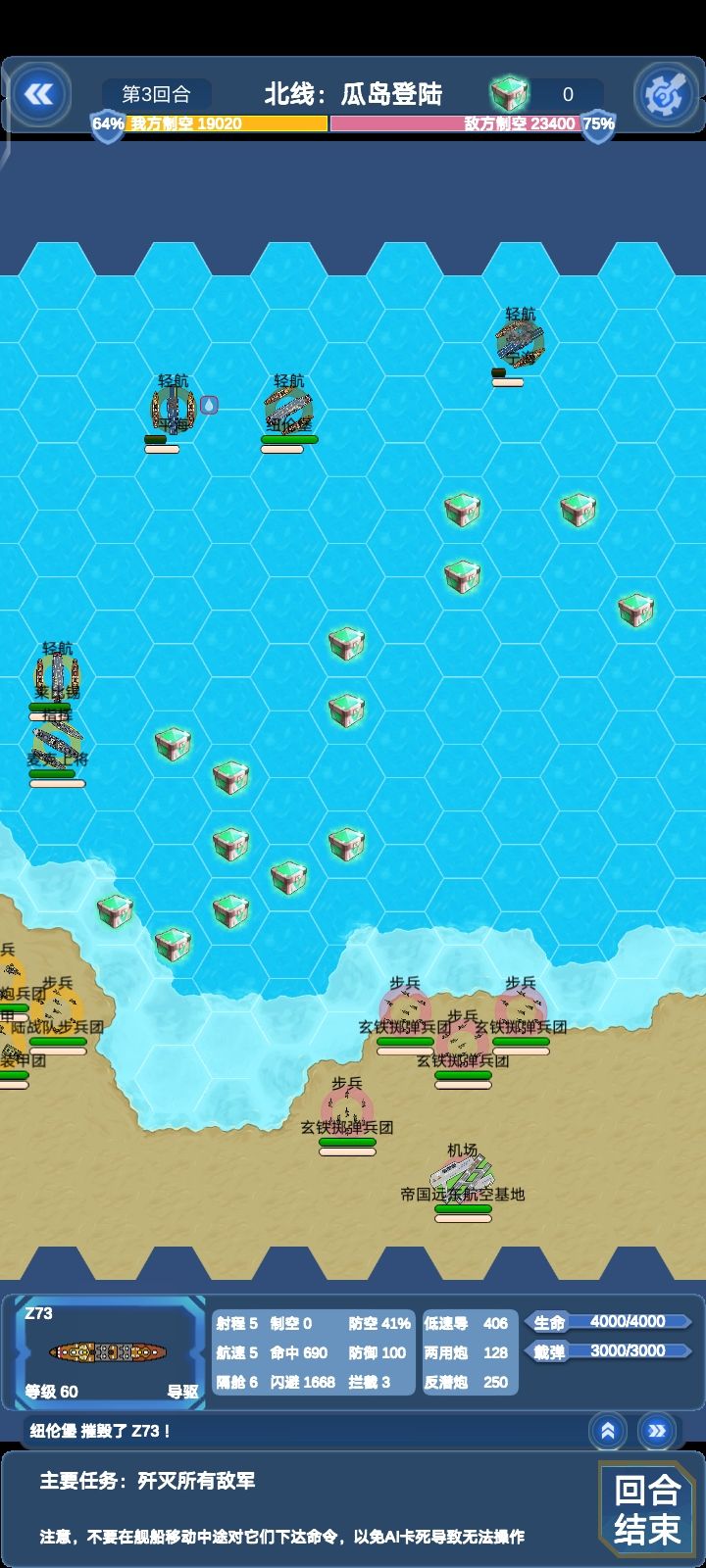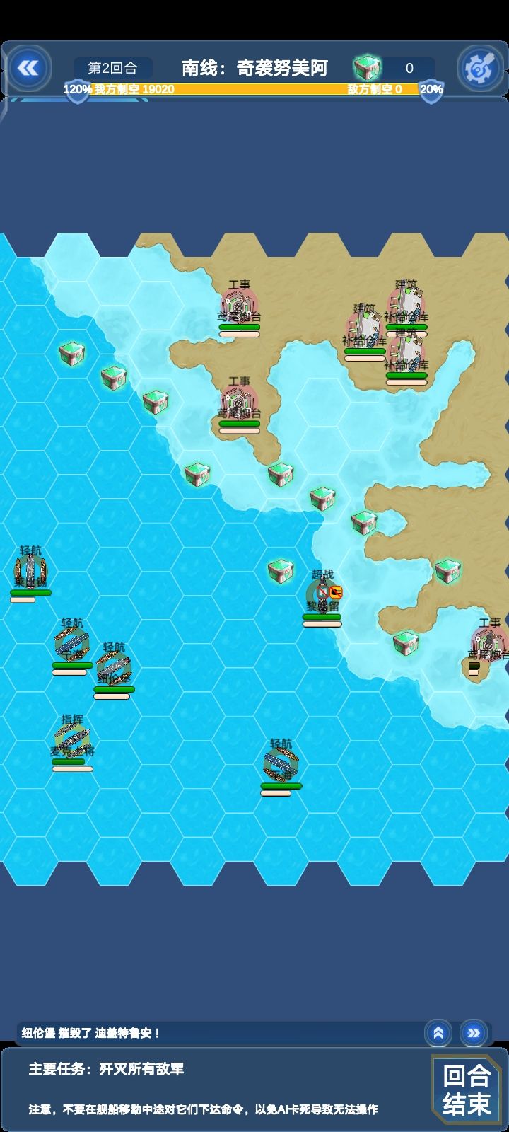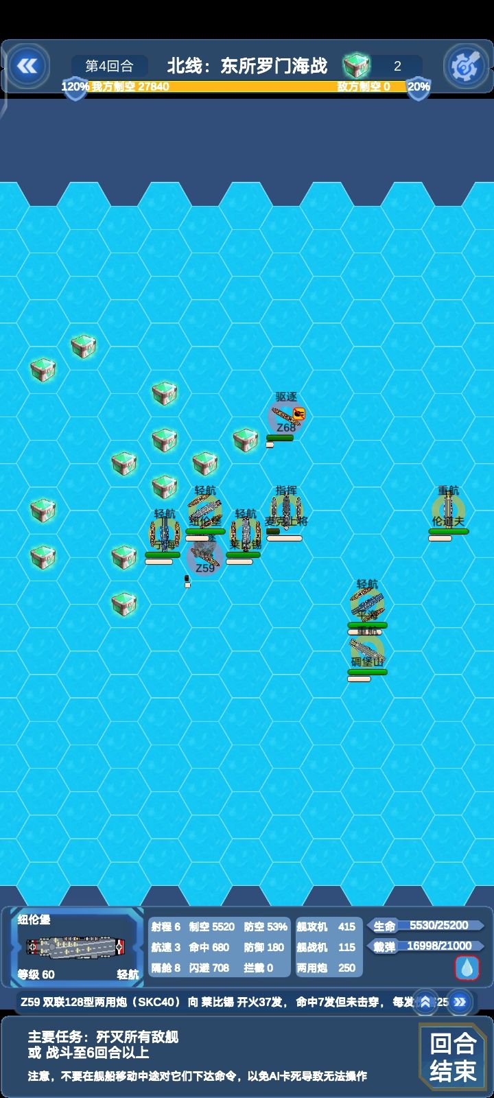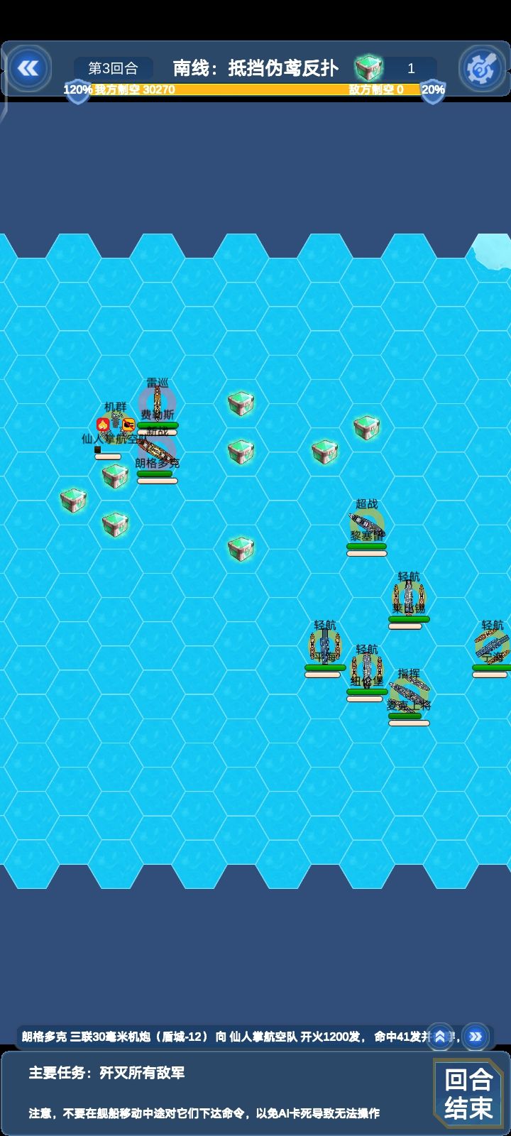 这关敌方所有对我方四艘轻航威胁都很大,建议位置不要太超前,还有如果完成支线:北线瓜岛登陆可以在这关和以后关卡获得仙人掌机群的援助,仙人掌伤害挺不错的,就是容易被打下来