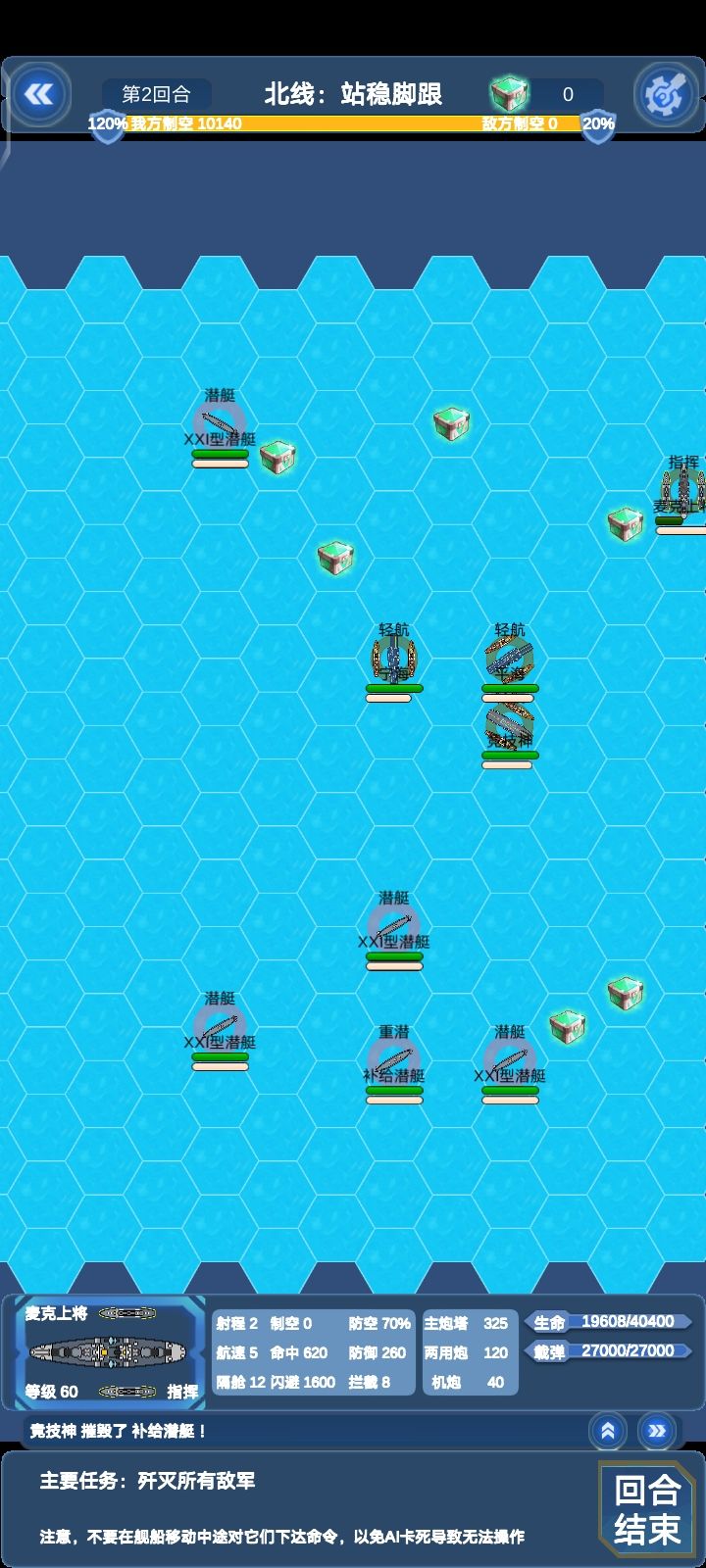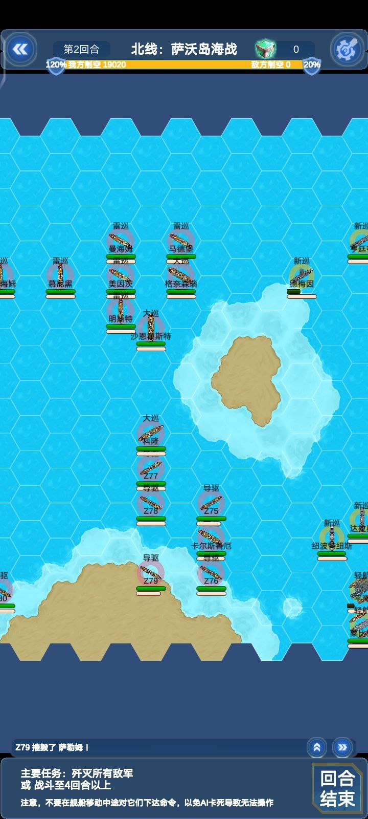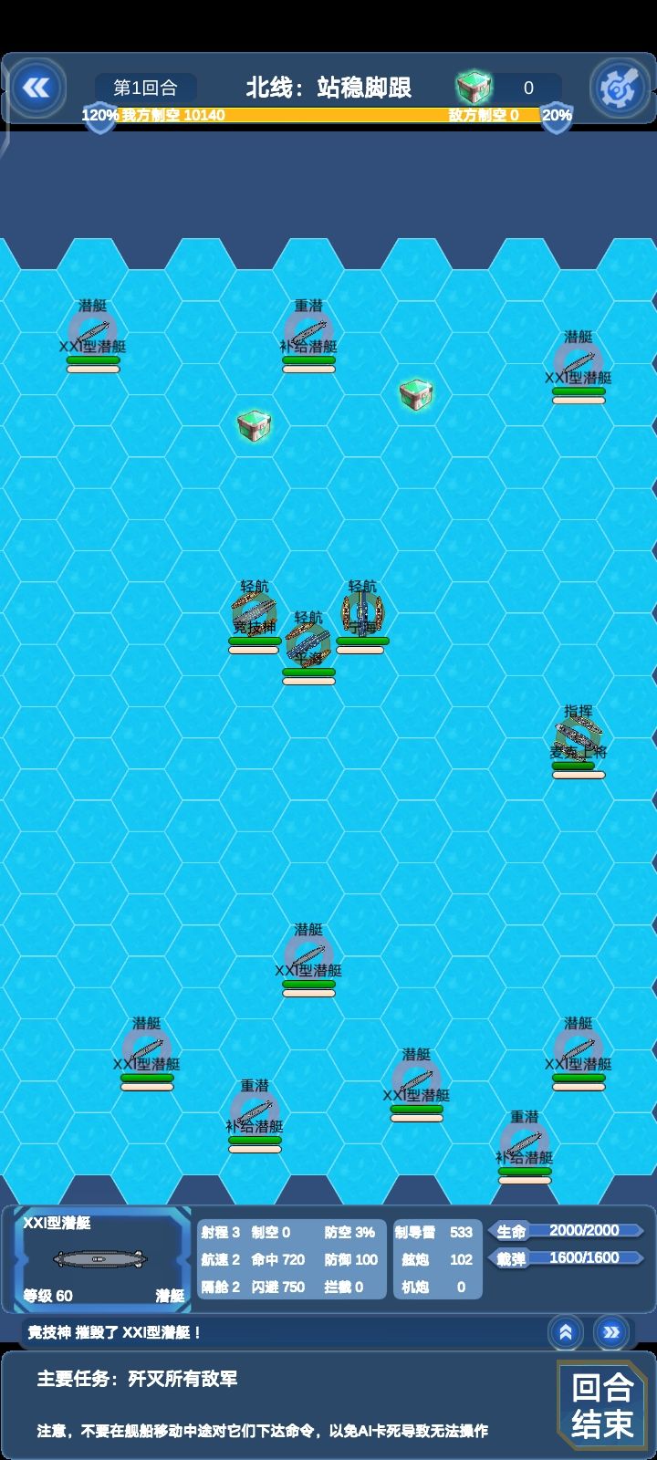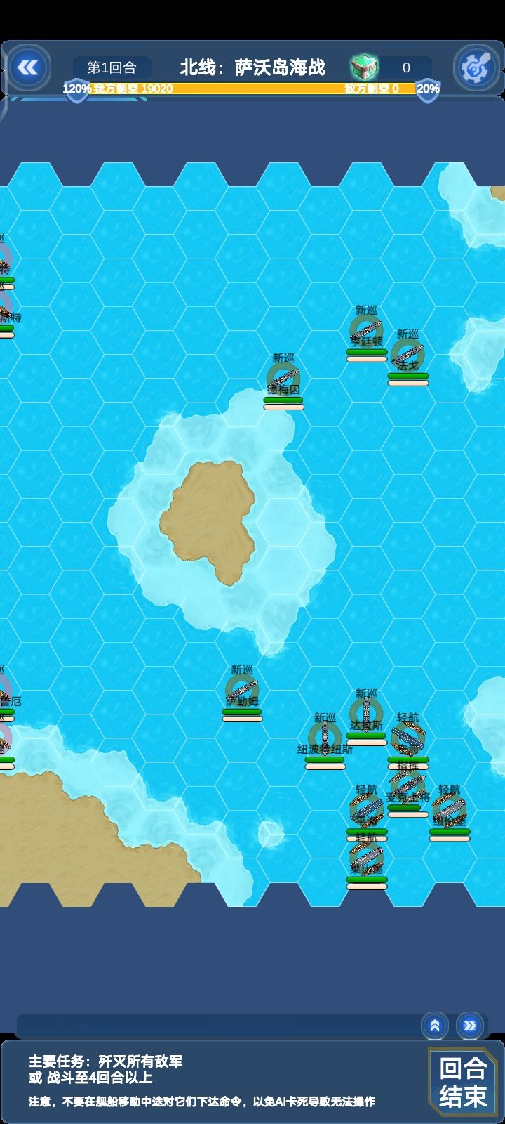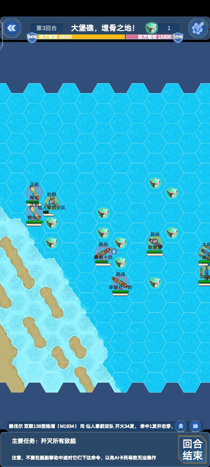 这关敌方所有对我方四艘轻航威胁都很大,建议位置不要太超前,还有如果完成支线:北线瓜岛登陆可以在这关和以后关卡获得仙人掌机群的援助,仙人掌伤害挺不错的,就是容易被打下来