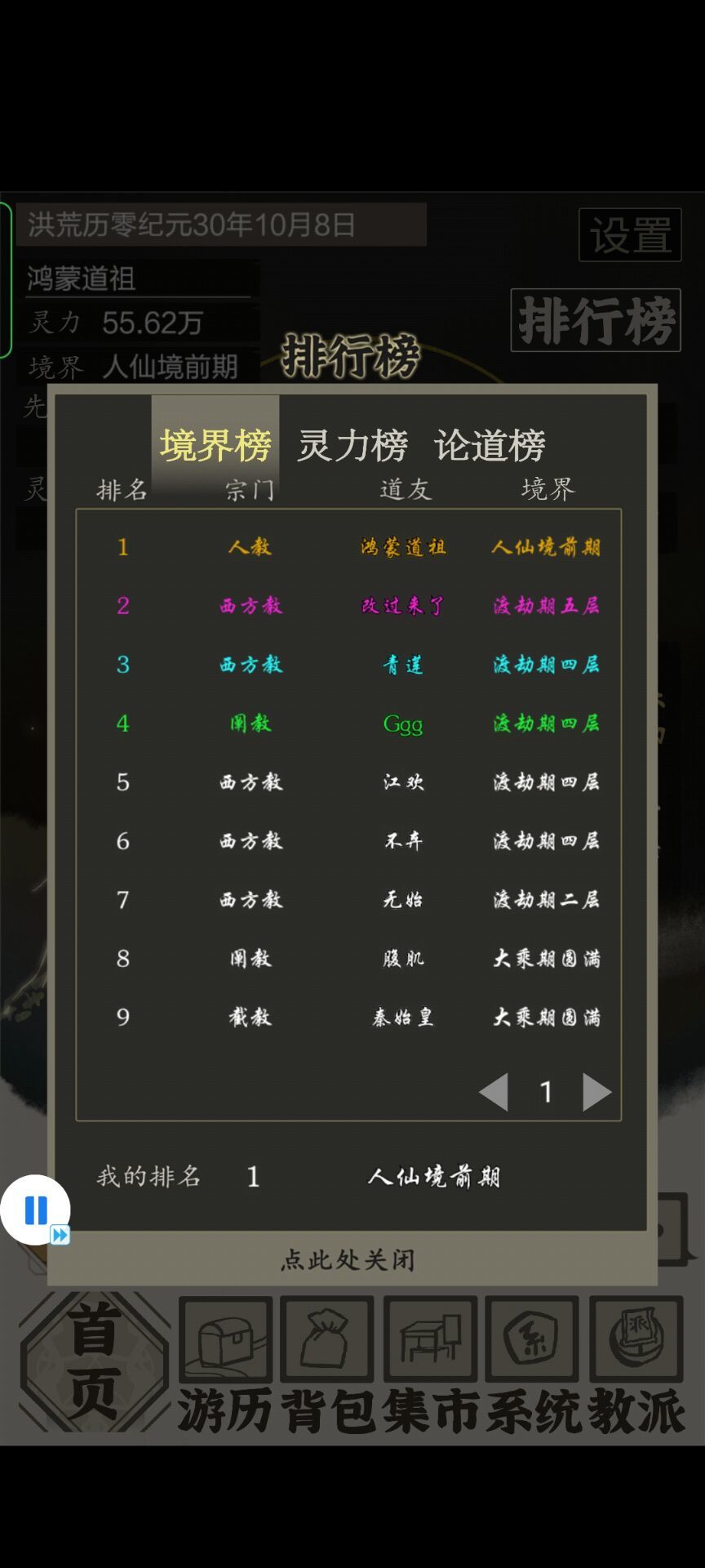11. 教派:刚开区先别加教派,最好等4个教派都有几个人能达成人数平衡了再进教派,教派最好加西方教 阐教,新手一般喜欢去截教最好不要进,教派人数越少越好,晚上11点报名教派气运。