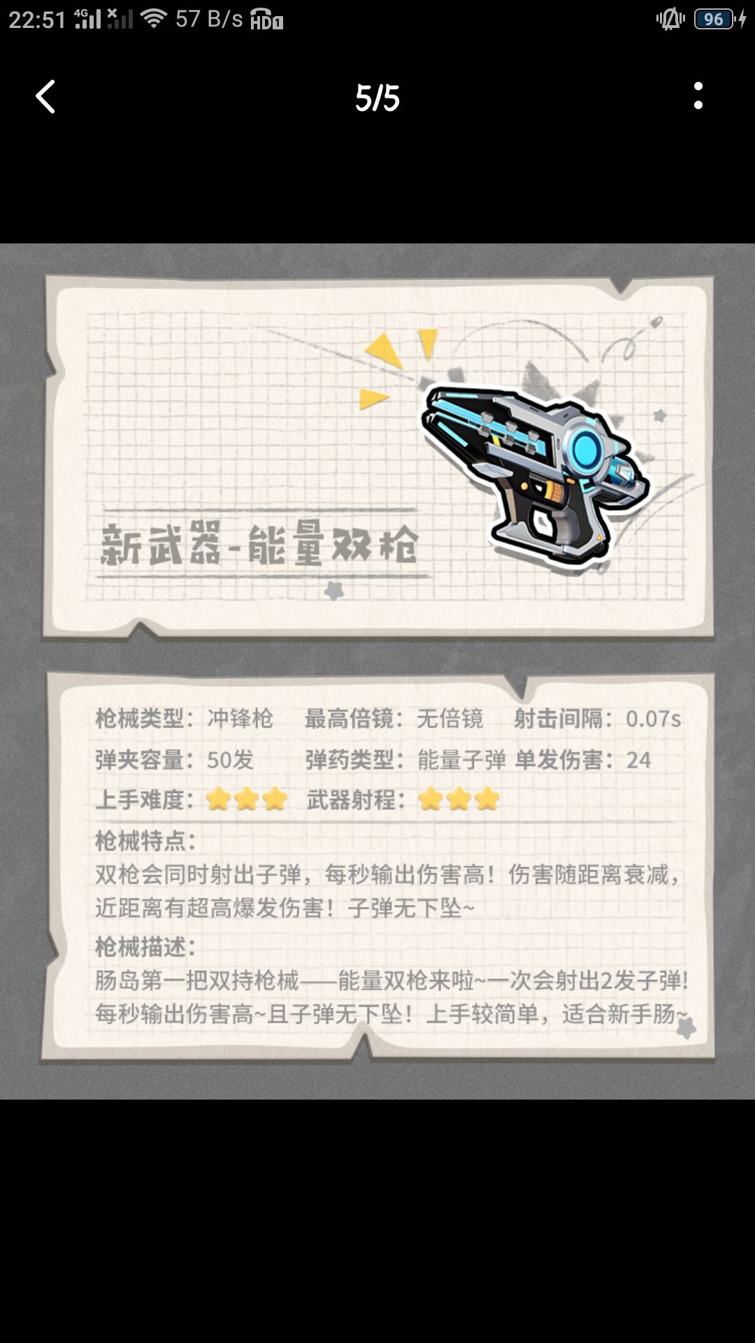 它是一个不能装倍镜的冲锋枪,弹夹容量5发 单发伤害24 优点:射速快,每秒伤害高,但伤害随着矩离衰减,子弹不会下坠。 缺点:子弹耗的快。 温馨提示:建议瞄的准的用,当然新手也可以,但要合理用,因为子弹耗的快!!! 能量双枪推荐指数★★★☆☆(这只是做者自身)