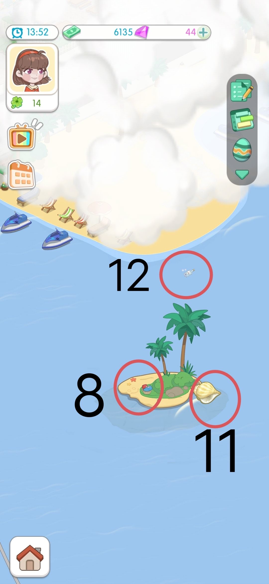 11、海螺(画面左边小岛上,有一只海螺,点一下会召唤鲸鱼)