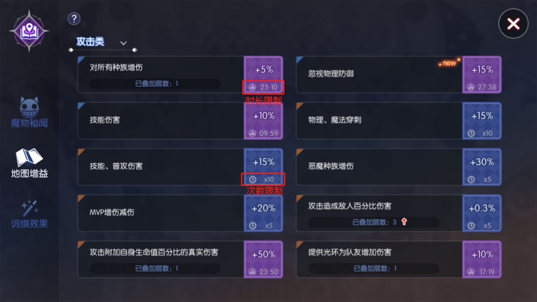*战斗效果分为时长限制次数限制,部分效果可叠加