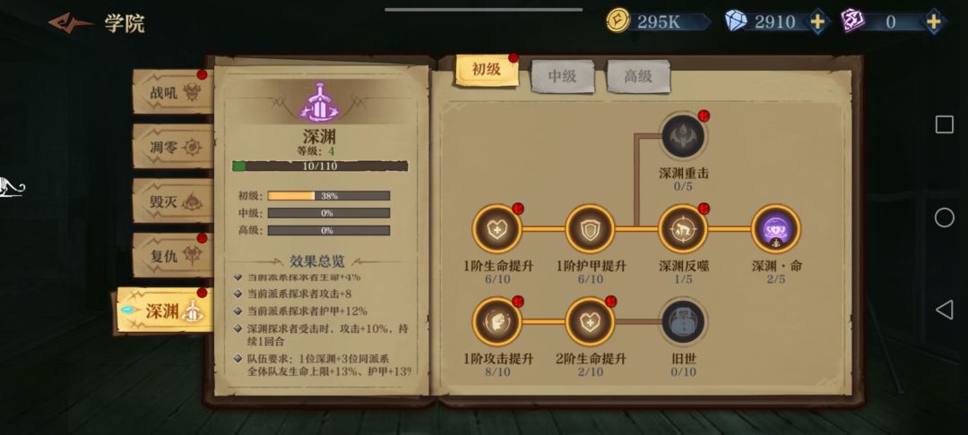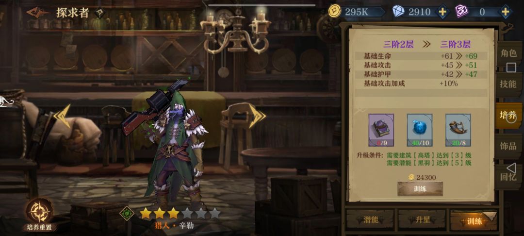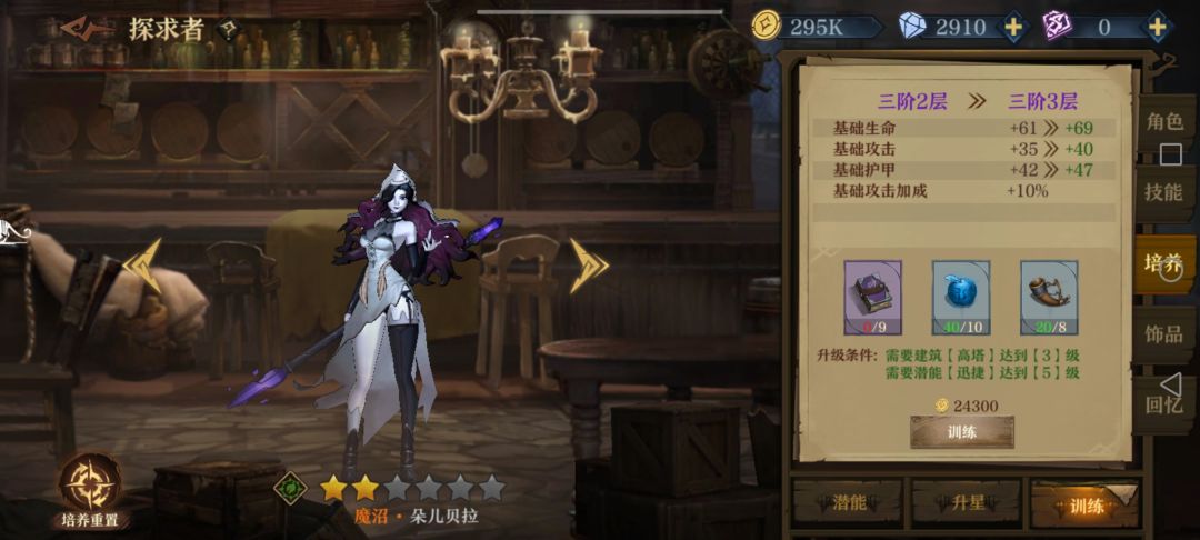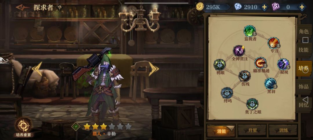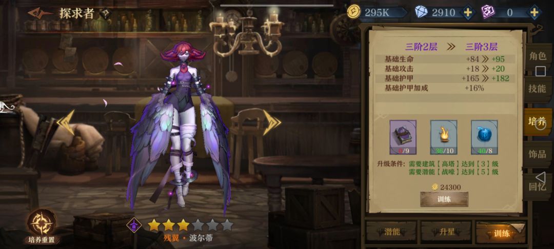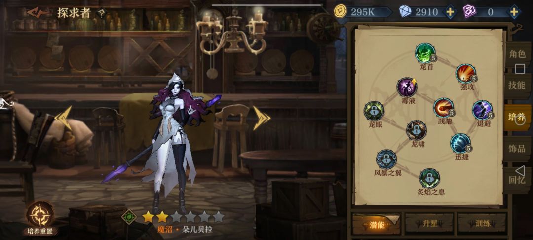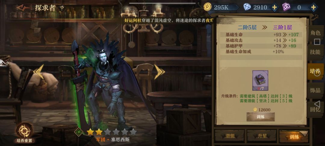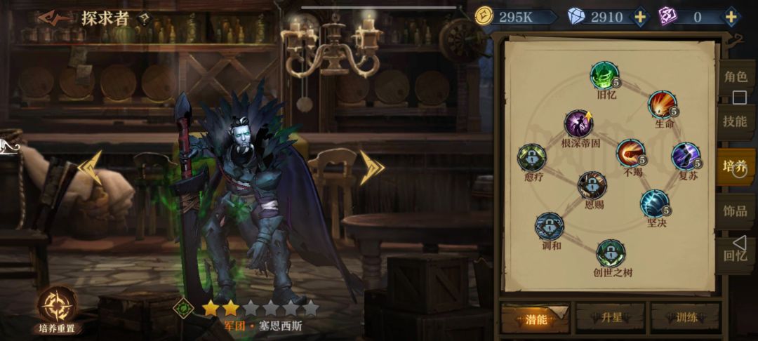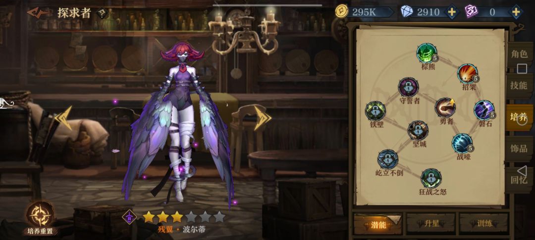 前期如果扛得住伤害,就加辛勒2112两发轻箭单体带走一个后排,否则辛勒21后先把波尔蒂的121点出来,加闪避同时防止辛勒被减命中,同时塞恩西斯点个1加免伤;3层以后要把朵儿贝拉的122(2)点出来防流血加易伤迟缓,感觉奶量不足时朵儿接着点2加攻击;然后塞恩西斯点22加毒前进配合波尔蒂刷盾。最后看情况如果有自身护盾类词条就给波尔蒂点1加抗伤,没有护盾词条或者有护甲词条就点2加护甲(比如说我就拿到了尖刺护甲,3000+护甲挨一下反四五百伤害伤害)。没有再生的话塞恩西斯肯定点1回血硬抗,反之点2攻防兼备。