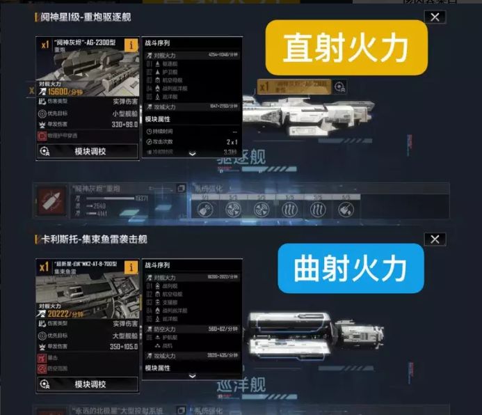 舰队中承担输出环节的武器分为两类:“直射武器”和“曲射武器”