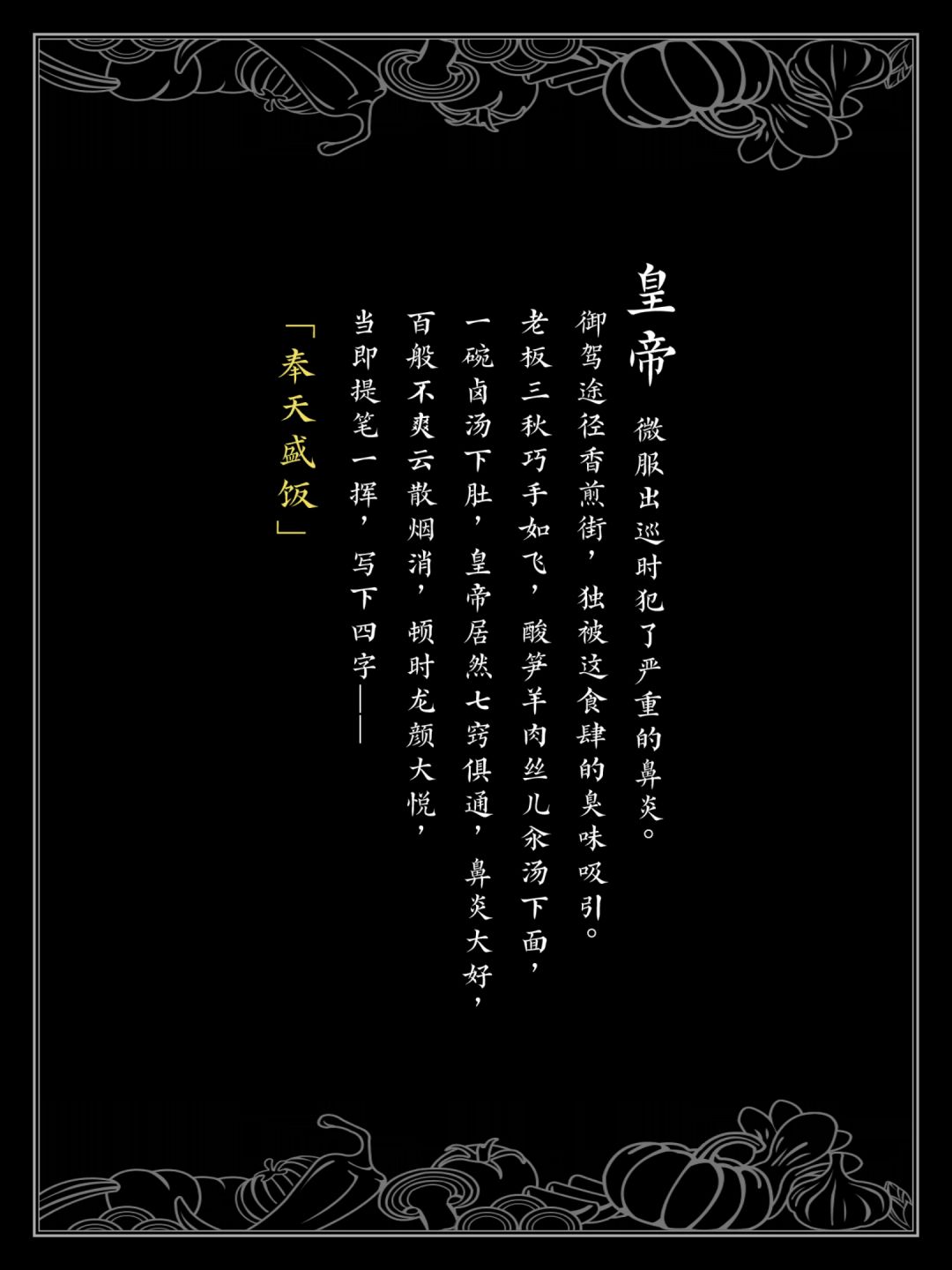 作为一个休闲类游戏,故事情节还是很吸引人的。主线部分在导入故事结束后,第二个关于火锅的故事十分吸引人,结果,剧情断在这里了!除此之外还有一些顾客的心事也能从侧面拼凑一些顾客个人的小故事。为了符合食肆这样以后具体故事背景,我认为这种柴米油盐家长里短的故事很合适,不一定非要多么宏大的世界观(在别的游戏里拯救世界太累了),人情冷暖才是我们这种普通人日常经历的,更容易引起共情的。