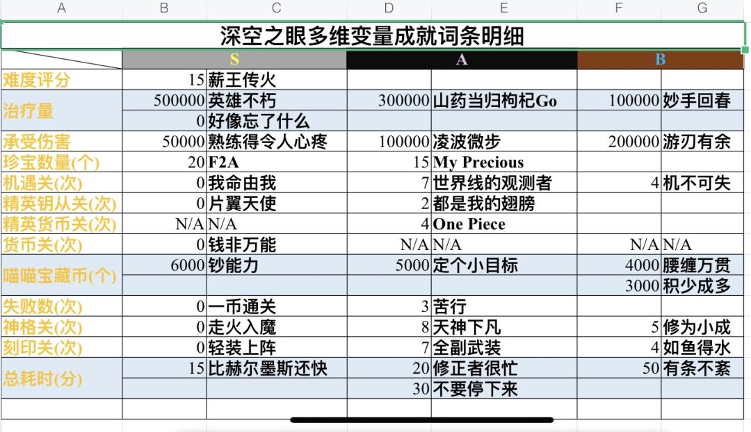 最初,其实小红走了一个大弯路,因为被这些花里胡哨的S,A,B的成就评级系统给迷惑了,所以很长时间以来我一直以为这个是左右最终评分的重要因素,于是我花了三天时间刷刷刷,整理制作出了开篇的表格。蓝后,满心欢喜的照着多完成S评价的方式去刷,结果……