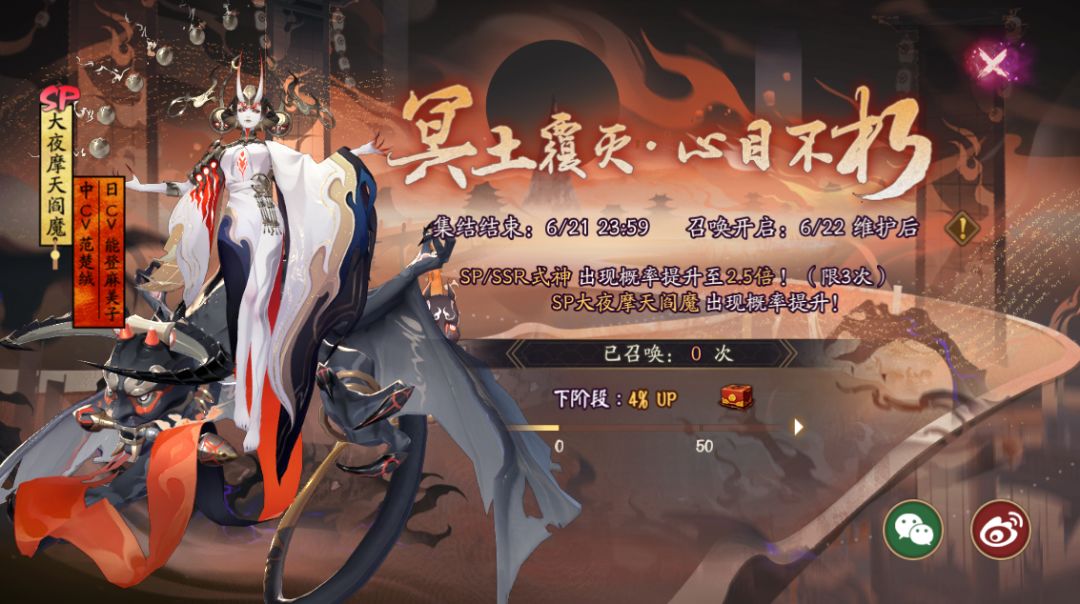 ※召唤期内使用神秘的符咒、勾玉、现世符咒进行召唤达到599次时,若仍未获得SP大夜摩天阎魔:对于6月22日维护前已达成SSR全集赏的大人们,第600次召唤必定获得SP大夜摩天阎魔,并额外获赠惊喜礼包一份。对于其他大人们,召唤满600次后,获得SP大夜摩天阎魔的概率将提升至25%。