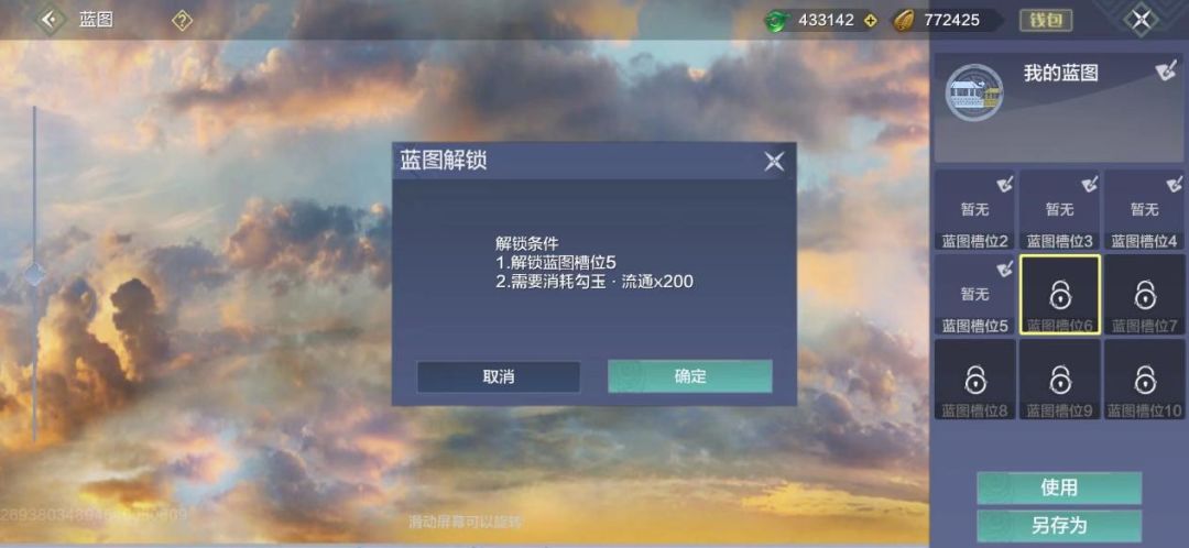 在家园页面,点击蓝图进入。默认会有一个蓝图的空位,前面2.3.4.5槽位解锁用贝币解锁就行了。第6个槽位开始需要用勾玉解锁,各位旅者记得看清楚了不要点错了哦!