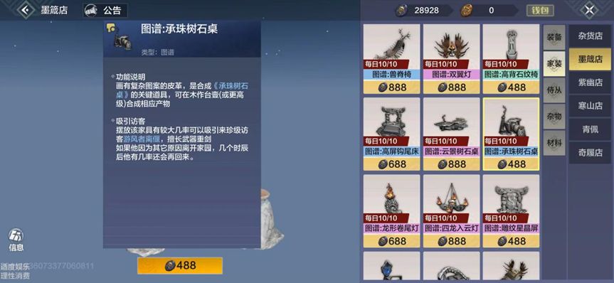 在貔貅台-墨箴店-家装,找到承珠树石桌、星云珠镜台等家具,可以吸引游风离偃等侍从到家里。