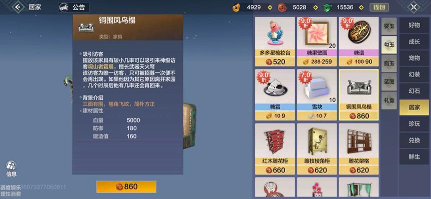 我们需要在商店-居家-勾玉,找到铜围凤鸟榻,可以吸引观山者霜晨到家里。放心这是唯一一件需要勾玉购买的,剩下的都是脂玉,墨箴石,紫幽石白嫖的。