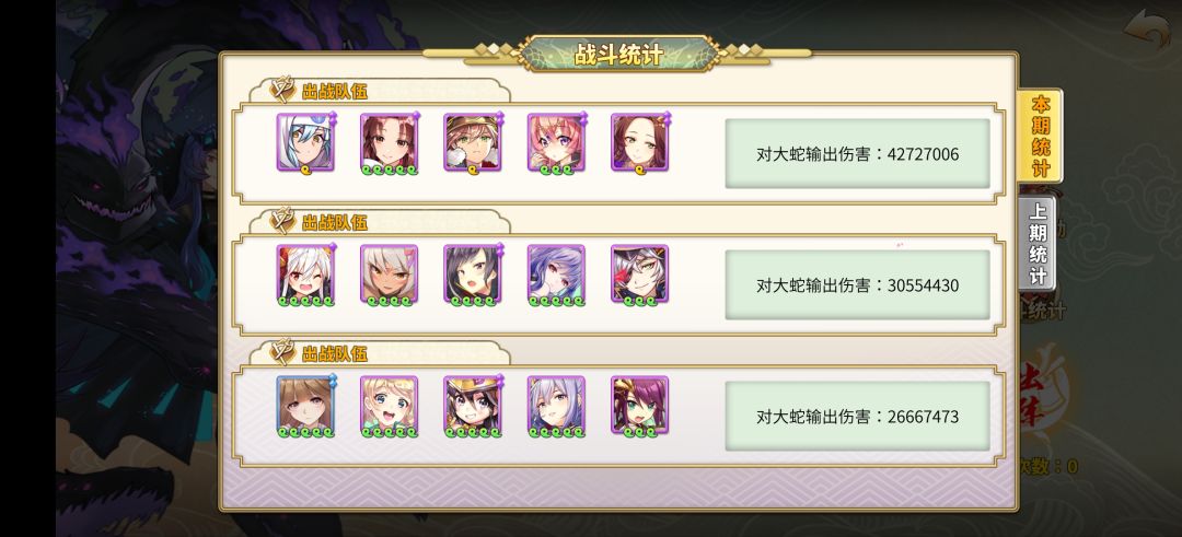 可以看到我的二队和三队在阵容上没有大c,也没有练度,但也打出了两三千万的伤害。都是让一个人装备咒缚扇,靠咒缚扇触发流血来打伤害。