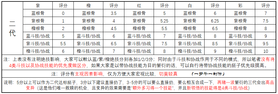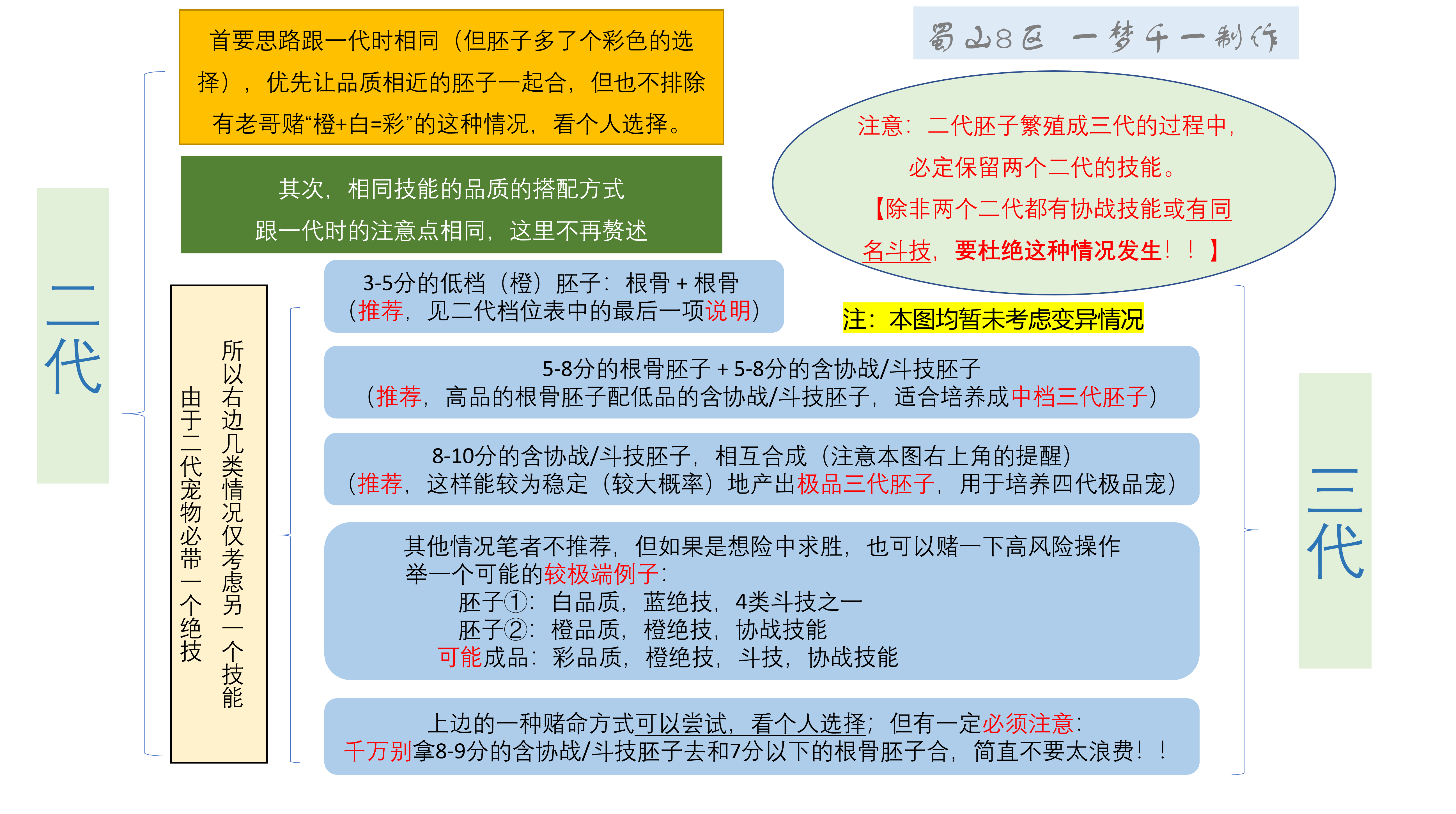 一代繁衍二代有两个目标:一是提高颜色品质,同时保留较高品质的绝技;二是领悟出斗技/协战技能(当然品质越高越好);