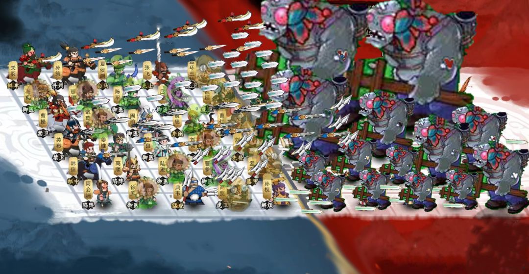 我方每积累一定粮草,摆一个将上去。NPC方源源不断出现小股部队,小boss偶尔出现,大boss最后出现 ……
