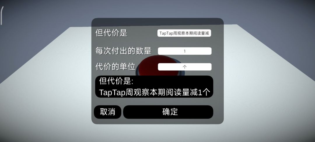 当然如果你觉得自带的这些代价不够好玩的话,游戏也支持自定义代价,设置好代价的文字描述,付出的数量和代价的单位就可以愉快地按起来了。比如“按一次按钮得到一万元,但是 TapTap 周观察本期阅读量减1”。