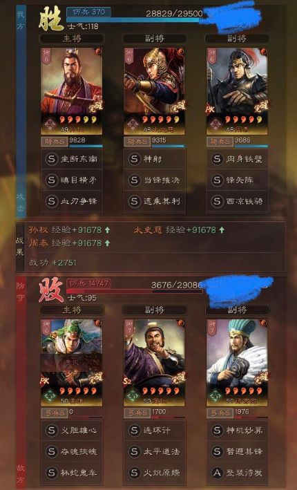 总结:孙权太史慈的玩法其实从S3赛季就开始流行,那时候主要是带鲁肃为主,到了PK赛季随着孙权的神辅助“周泰”登场,在周泰自身BUFF配合锋矢阵的情况下,一旦孙权打出西凉铁骑的暴击效果,很容易在一回合里瞬间打残对手,缺点的话多避开虎臣弓或者带盛气凌敌的青州枪,算是比较大的天敌了,打一些中速慢速的队伍则拥有比较大的优势!
