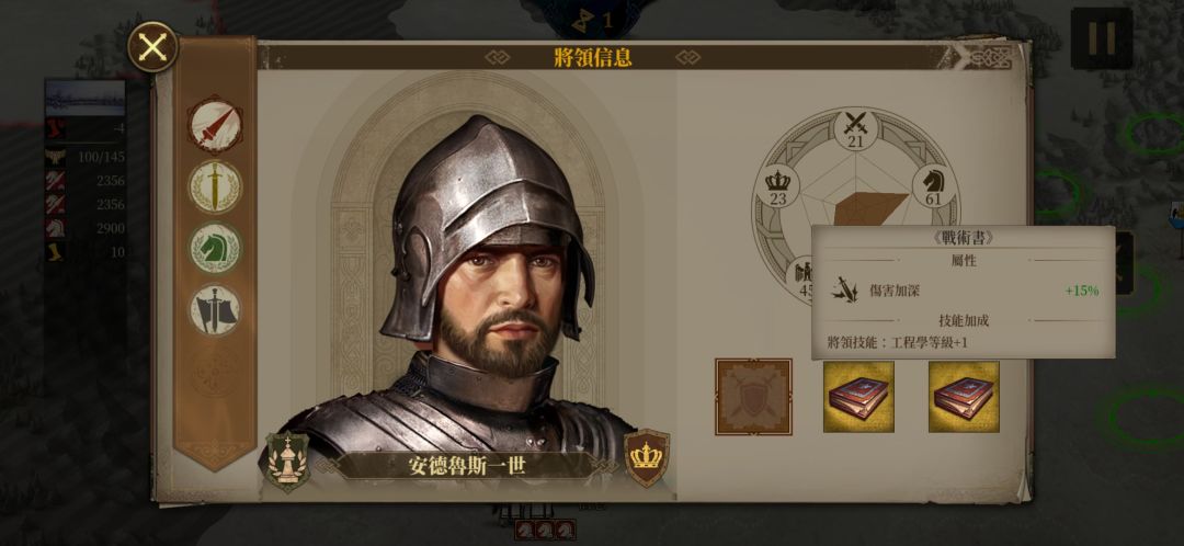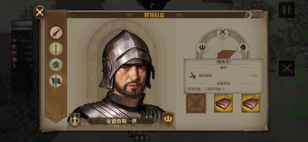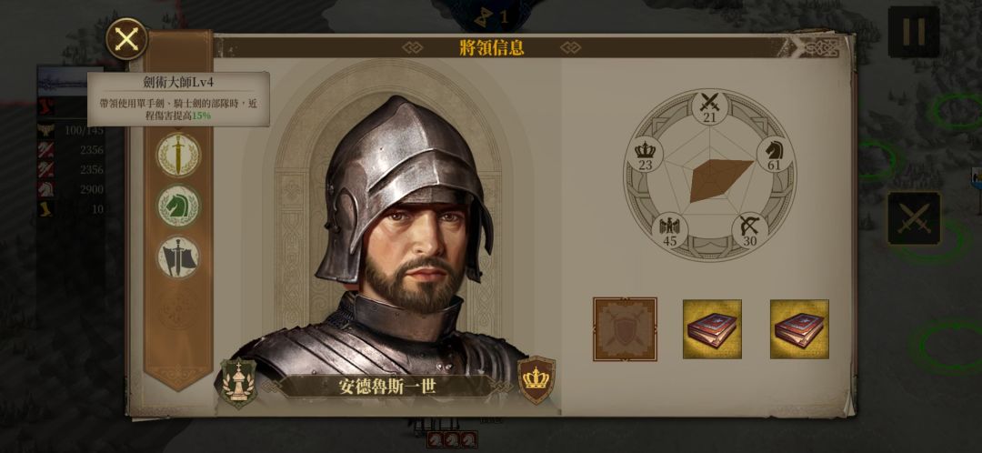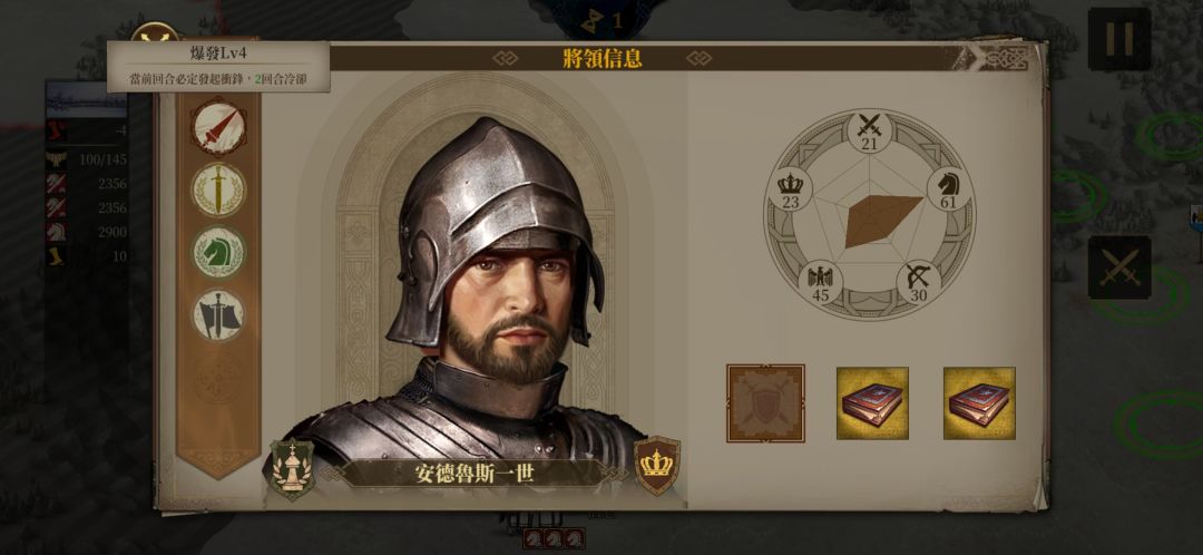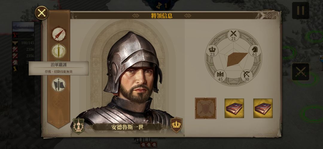 然后我们再看一下安德鲁斯将军的装备,很明显,安德鲁斯将军是读书人,开局自带两本智者所编写的书