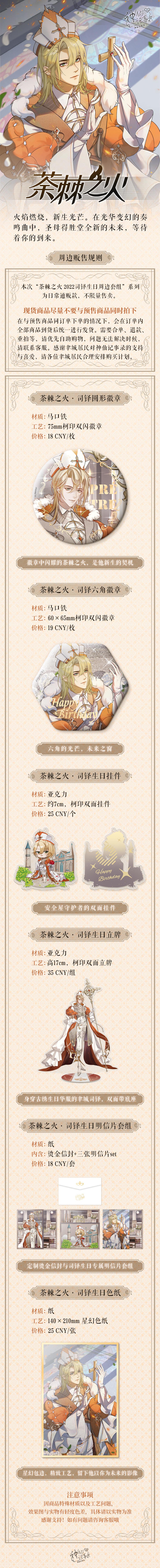 在本帖评论区留言一段祝贺司铎生日快乐的话,7月21日抽取5位幸运的聿城居民赠送随机一份【荼棘之火】套组司铎生日周边!