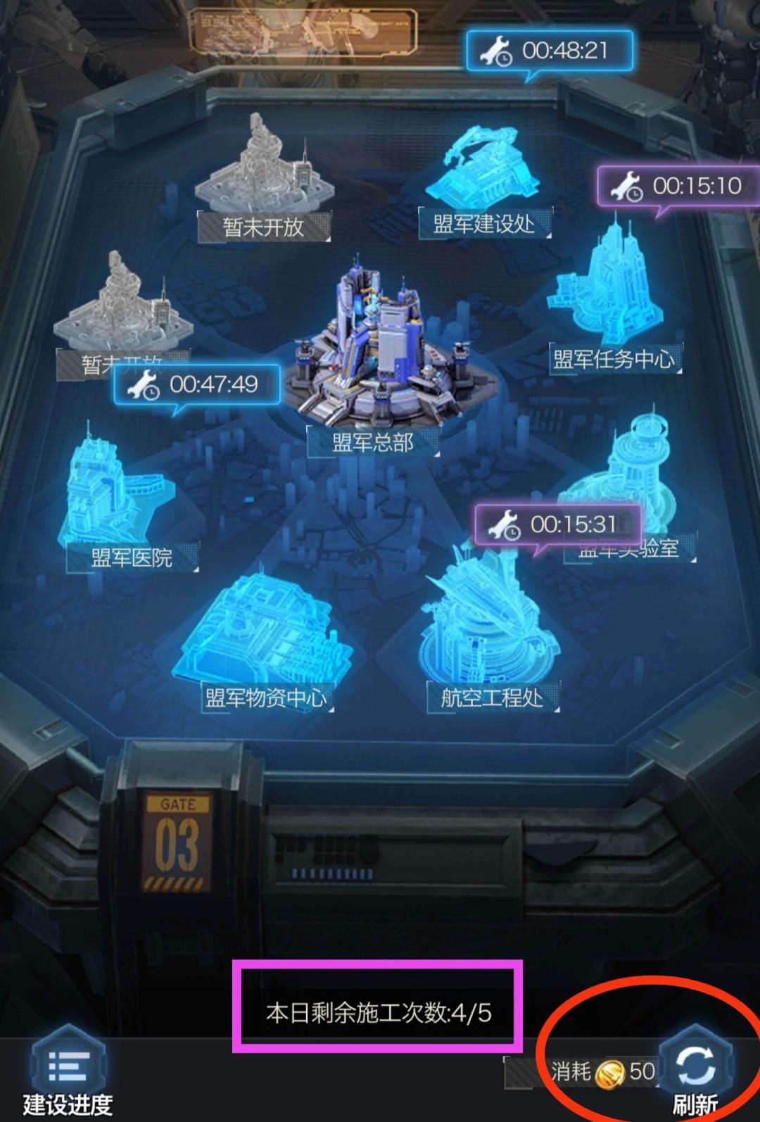 四、施工任务的完成需要派遣队列到对应建筑,完成施工后队列将自动返回。指挥官可以在期间随时召回队列,但将失去已有的任务进度。因为每日施工次数是在完成施工时才会扣除,所以中途召回是不会消耗次数的。