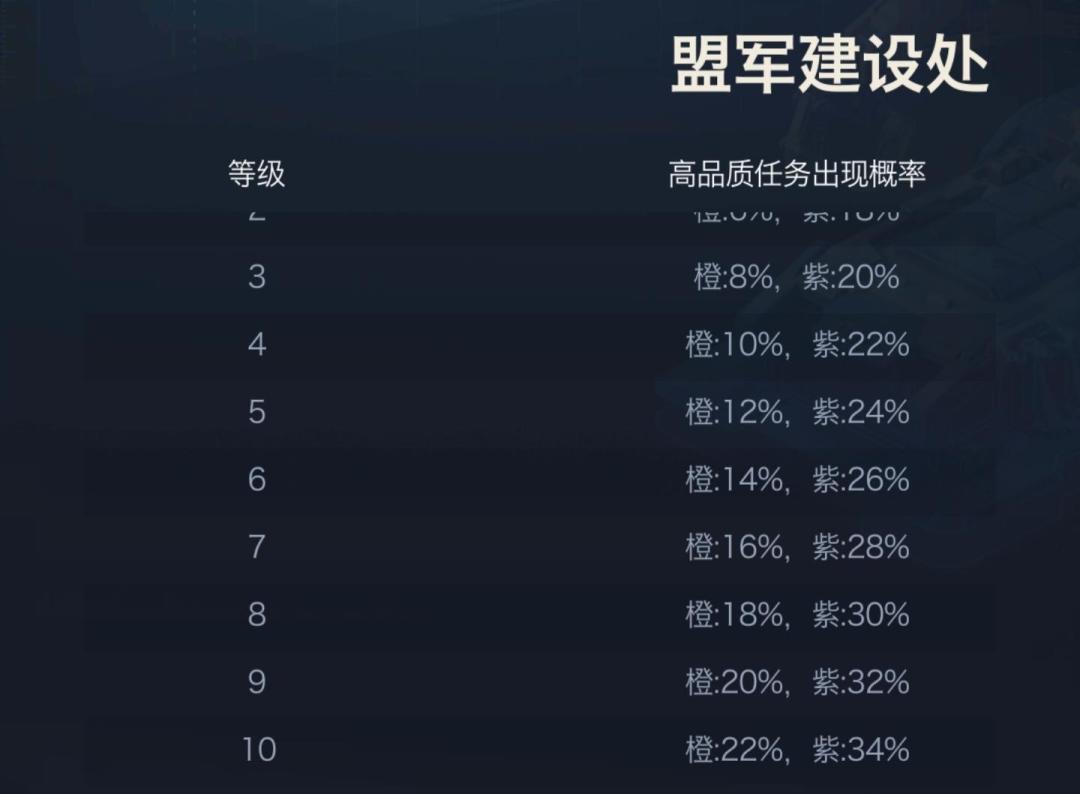 随着盟军建设处等级的提高,高品质任务出现的概率随之增加,当盟军建设处达到10级的时候,橙色任务出现概率为22%,紫色任务出现概率为34%。