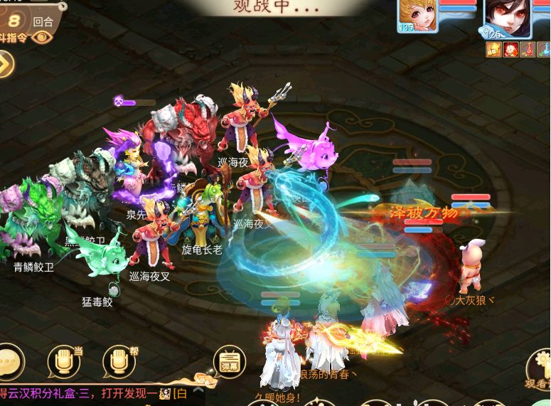 讲解:录像内的5个玩家,都是1转107级,这个套路的核心是治愈和隐身:【只要场内有己方单位,身上有治愈状态的单位在下回合开始,就可以站起来】。由此不难理解,只要下回合开始的时候,还有一个宝宝在场,那么就都能站起来,这个宝宝就一定是隐身宝宝。推荐阵容:双魔,治愈龙,男人,第五个人随便来个输出。原因是双魔杀的更快,十几回合搞定,如果只有1个魔,那么需要的隐身宝宝数量就会大大增加。下图右侧带凤凰的金不换是一个男魔。