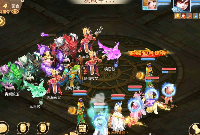 上图第四回合,由于上回合最后主怪火眼,男人的果子没有隐身状态了,金不换男魔叫了个隐身果子,另一个男魔单抽,男仙单秒,龙继续治愈。
