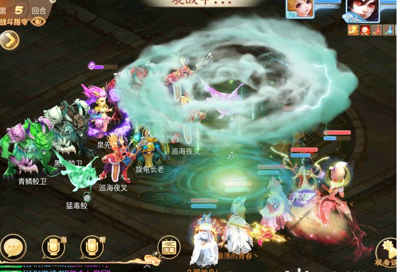 上图第一回合,男魔起速,狐狸给自己打隐身,龙治愈,男人单混蛟卫没混住,另一个男魔单抽主怪,问题不大。