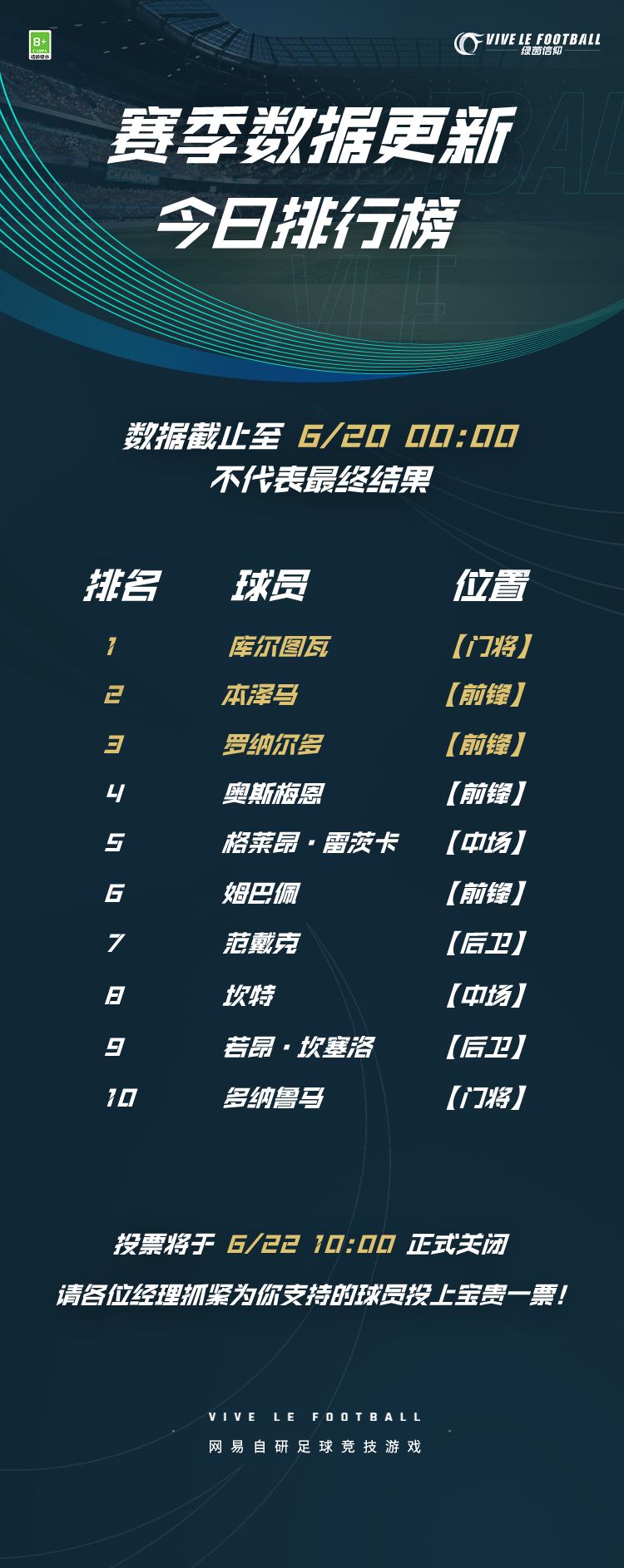 ◆结果公布:官方将于投票活动结束次日完成数据统计并公布投票结果。6月24日游戏维护更新完成后,相应球员所调整的属性就将生效。