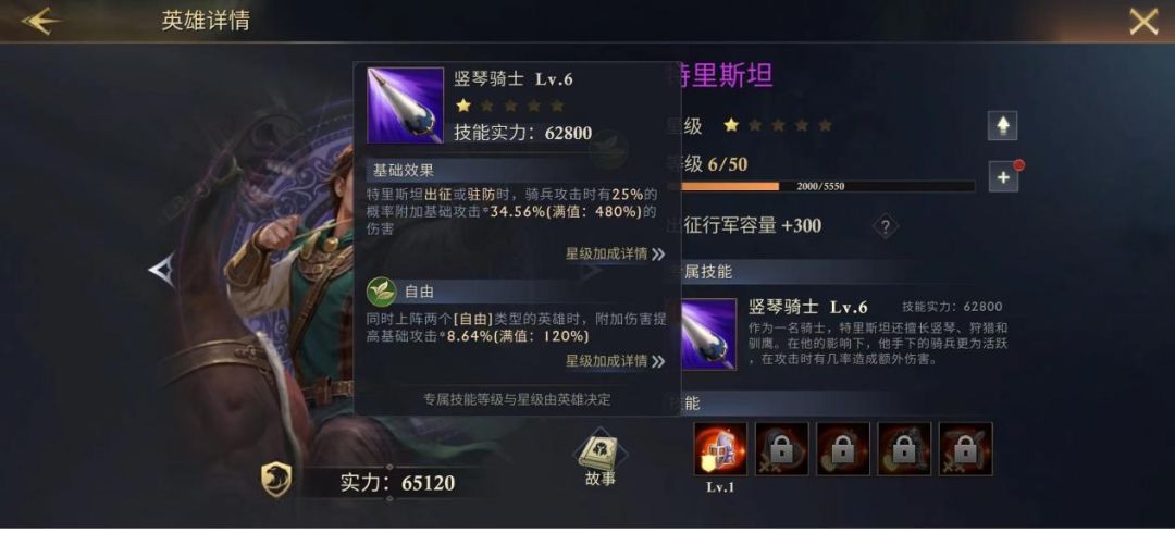 特里斯坦的第一个技能是提升骑兵防御,开荒期起到的主要作用并不大。