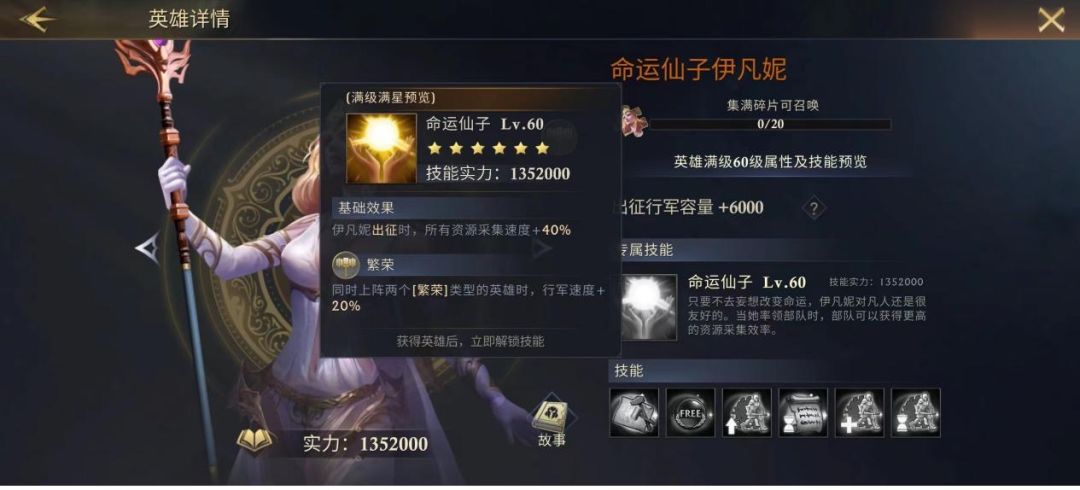 作为首充英雄,伊凡妮则主要担任采集队里的主力,专属技能提高所有资源的采集速度,快速发育进入第一批队的必要条件,在现阶段还没有得到英雄奥勒留的话,可以随便搭配任意拥有“繁荣”词条角色进行过度,属于入手必练角色。