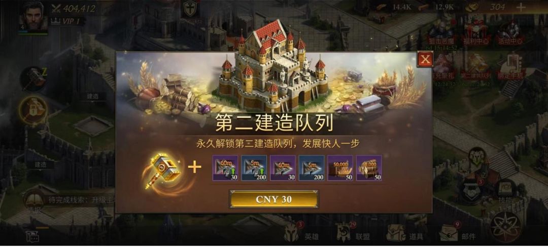 2、第二建造队列:开通后永久获得第二个建造资格与若干加速卡和木材粮食,建造是游戏必备的玩法之一,提升建筑的等级,在等级较低的时候看似不重要,但是要塞到达5级以后,时间就开始 越来越久,这时候第二建造队列就显得弥足珍贵了。同时,在第一天入手的话,资源容错率高,培养进度也能更快。