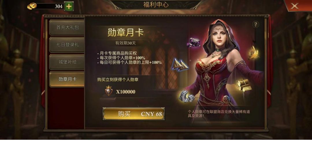 3、月卡:开通后激活专属商店,其获得的勋章除一次获得的10W勋章外还可以让领主们每次出门占领获得的个人勋章上限+100%,就单独看个人勋章的回报率,就挺不错的,更不要说个人勋章购买的资源带来的提升。
