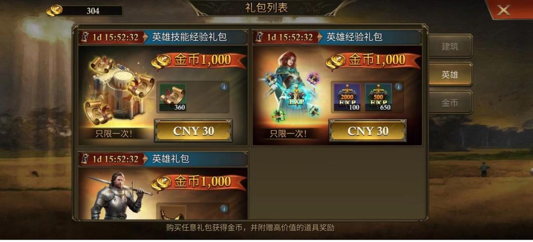 4、商城礼包:在新手期会遇上英雄池浅,英雄经验和技能等级跟不上,这里推荐把只限一次的礼包全部入手一轮,总共获得3000金币、115黄金号角与英雄技能点,这样大幅度补强野怪和采集队伍强度,成长速度将呈倍速增长。