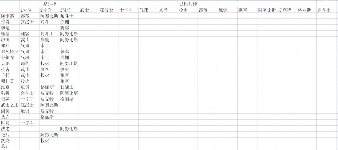 当了解了这些前置条件,我们开始洗兵种,洗兵种的时候最重要的一步是列表(如下表)