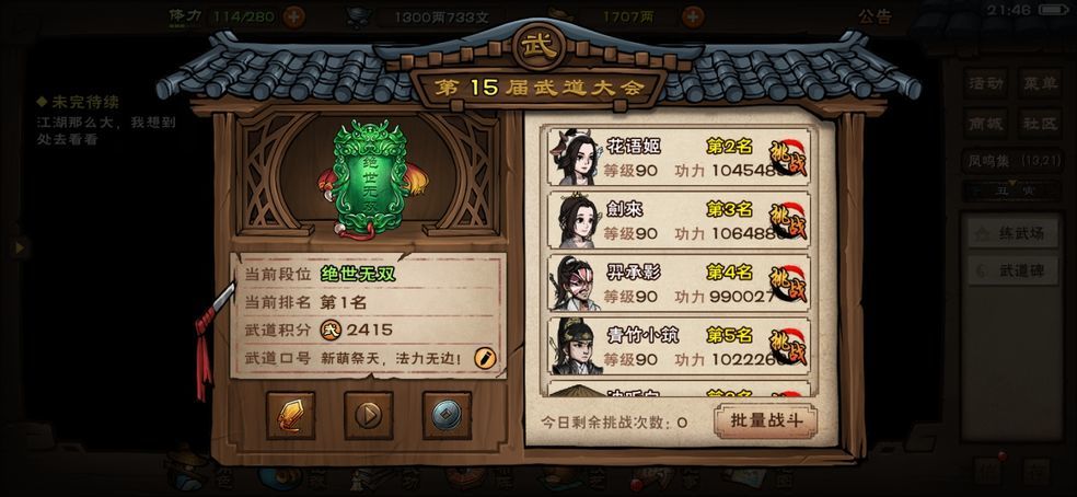 游戏已到后期,你也基本毕业了。除非蓝鲸把100做出来(100副本,装备,绝世武功,武神殿势力)