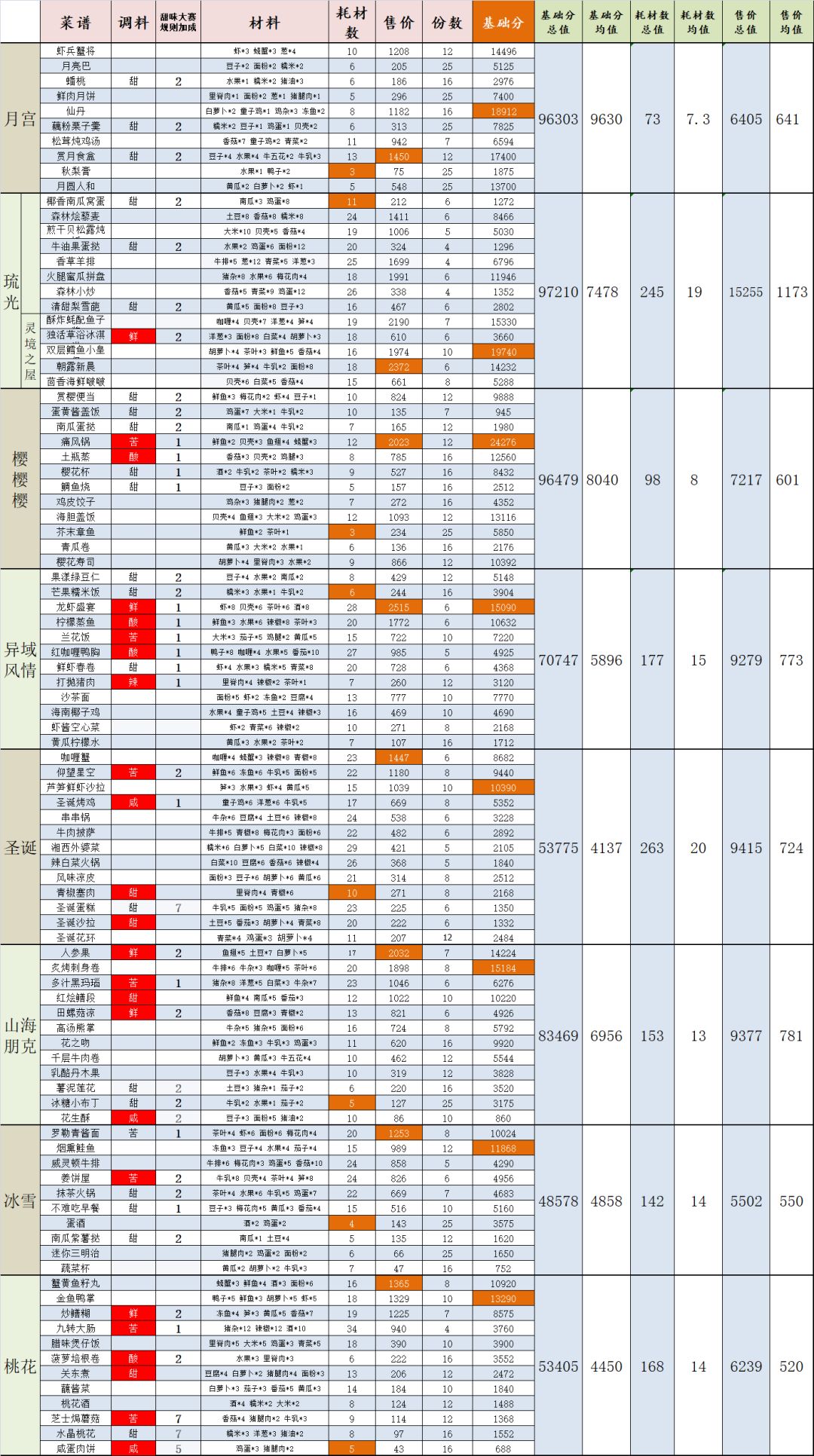 注:耗材数,售价与基础分标红单元格,