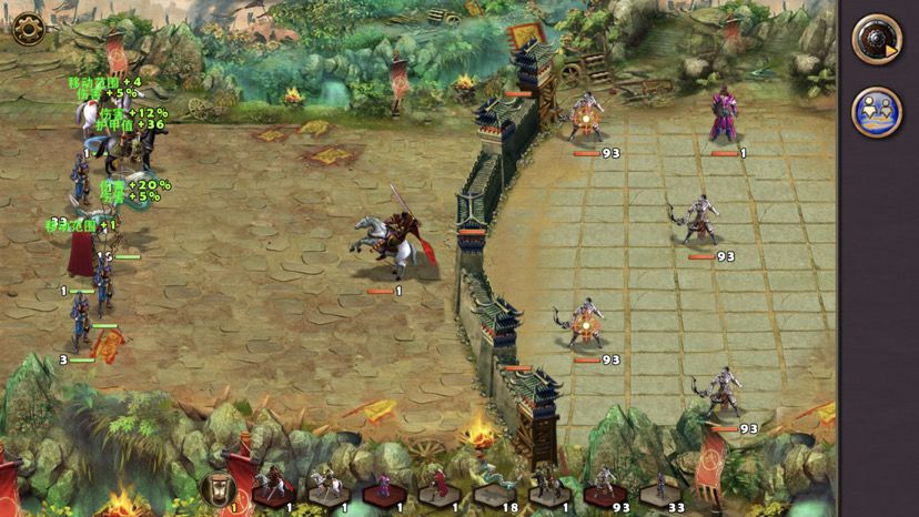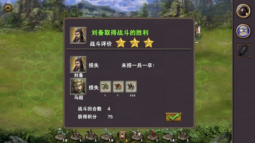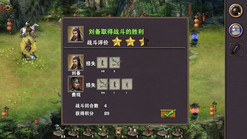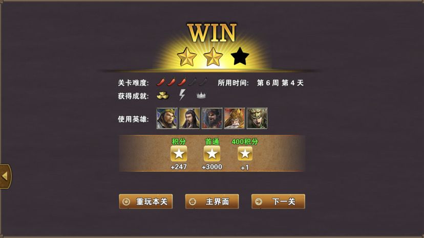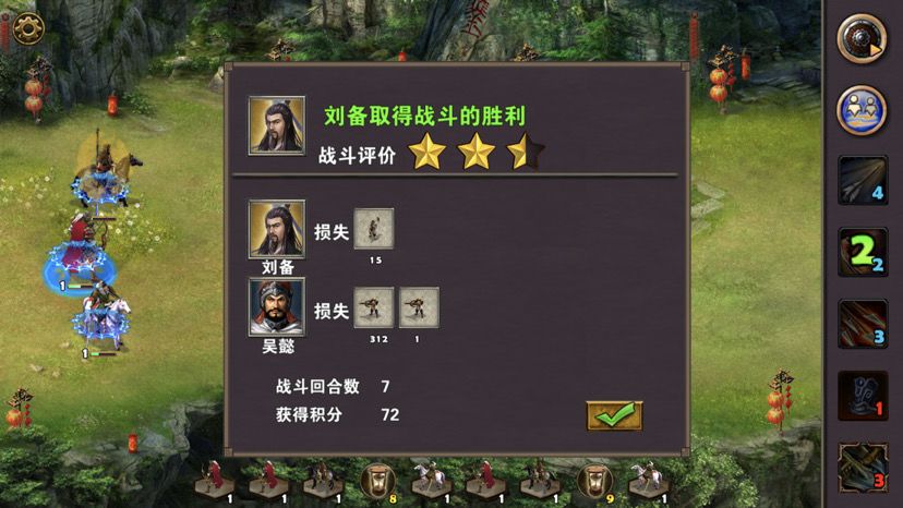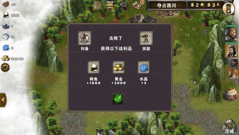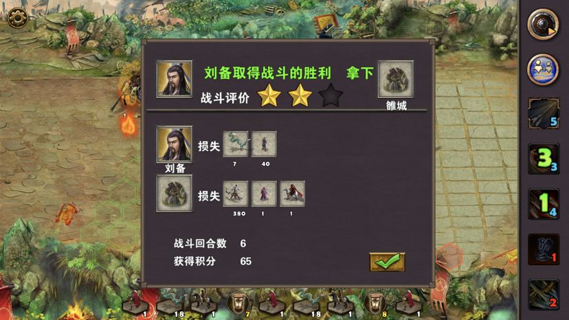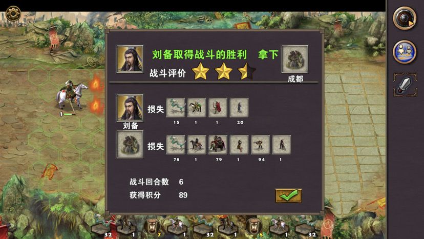 这关相比前面关卡难度骤增,由于我装备不够,几个英雄东拼西凑才弄齐一身装备,而且没有龙啸卡,所以暂时以过关为主不打三星,下面简要说明一下打法流程,兵种推荐:青龙,战术卡推荐:龙啸、青龙之痕,炼金术、木工术,装备如图,英雄装备根据自己装备情况酌情分配。这关用到青龙,招募青龙需要水晶,所以开局先查看一下涪城翰林院有没有炼晶术,没有就重开,如果能同时刷到炼晶术和唤雷术,过关就好打很多,进入地图后诸葛亮一路向上打小怪占领资源,打怪的时候有时候会出现转盘,如果有VIP可以免费重转一定要转到水晶,张飞第一天把兵全分组,沿路捡资源靠右走在树林下面一点停留,第二天严颜带鹰卫出城,张飞过去打严颜,推荐张飞装备/冥蛇、虎御金盔、勇士战凯或者蛮皮斗铠、五色石、龙鳞护腕、赤兔、破虏铁鞋,这套装备打严颜很轻松,这些装备好多我都没有,所以只能使用其他装备去打,打掉严颜后,上面的路就通了,张飞和诸葛亮一样沿路上去占领资源打小怪,当诸葛亮走到桥头,张飞走到尽头有守卫把守的地方后会触发剧情,张飞加入刘备队伍,同时涪城前面出现几位英雄,刘备可以选择一位加入队伍中,一般选择黄忠,诸葛亮过桥后会发现两个boss吴懿、雷铜,诸葛亮如果没有好装备打不了吴懿,可以把他引过去让刘备打,刘备带着张飞、黄忠打掉吴懿不难,吴懿有被动技能寒风,每回合定身对面全体单位,雷铜带着吴兰还有一群大象不太好打,雷铜特技盾墙/友军全体获得90%远程减伤,吴兰技能铁障/友军全体免疫范围型有害效果和伤害,如果不想打雷铜可以让诸葛亮带着他到下面溜圈,算好移动距离,诸葛亮既不让他追上又不要跑太远,这样雷铜便会一直跟在诸葛亮后面,刘备可以放心在上面打小怪占领资源,发展城池,城内建筑主要发展府邸、民居、翰林院、青龙崖、寺庙,其他的不用管,刘备记得去学习石碑技能神雷,如果装备不是太差、2周多时间可以招募10多条青龙,刘备可以去打雒城张任,青龙飞进城里打鹰卫,其他人打张任,首次打败张任后获得任务奖励一孔七色鹿,第二天马超从右边出现,打败马超后,全涪城前面对话马超便会加入队伍。我由于装备太差所以拖到有20多青龙才去打张任,打败张任、马超后休整一下从雒城后面上去,有演武场、凉亭可以访问,然后钱大堵路boss费观,打费观可以从前面招募一组农民吸引伤害,注意刷开局不要被后面的冰、火机关打到青龙和刘备,英雄可以挂,青龙尽量保住不死,打完费观,回去休整一下,招募青龙,回血回蓝,再招募一组农民,然后去攻城打成都,最后决战,注意站位,刘备开大激将青龙先灭掉右边武当,然后打城外俩boss和对面青龙,刘备给队友回血,当把对面青龙、武当和门口俩boss灭掉后,青龙飞进城内打boss,另外三个英雄负责打大象,城内boss有远程减伤,所以只能用青龙飞进去贴身打、打下成都后成功过关!附图,三星打法之后有时间再补上!