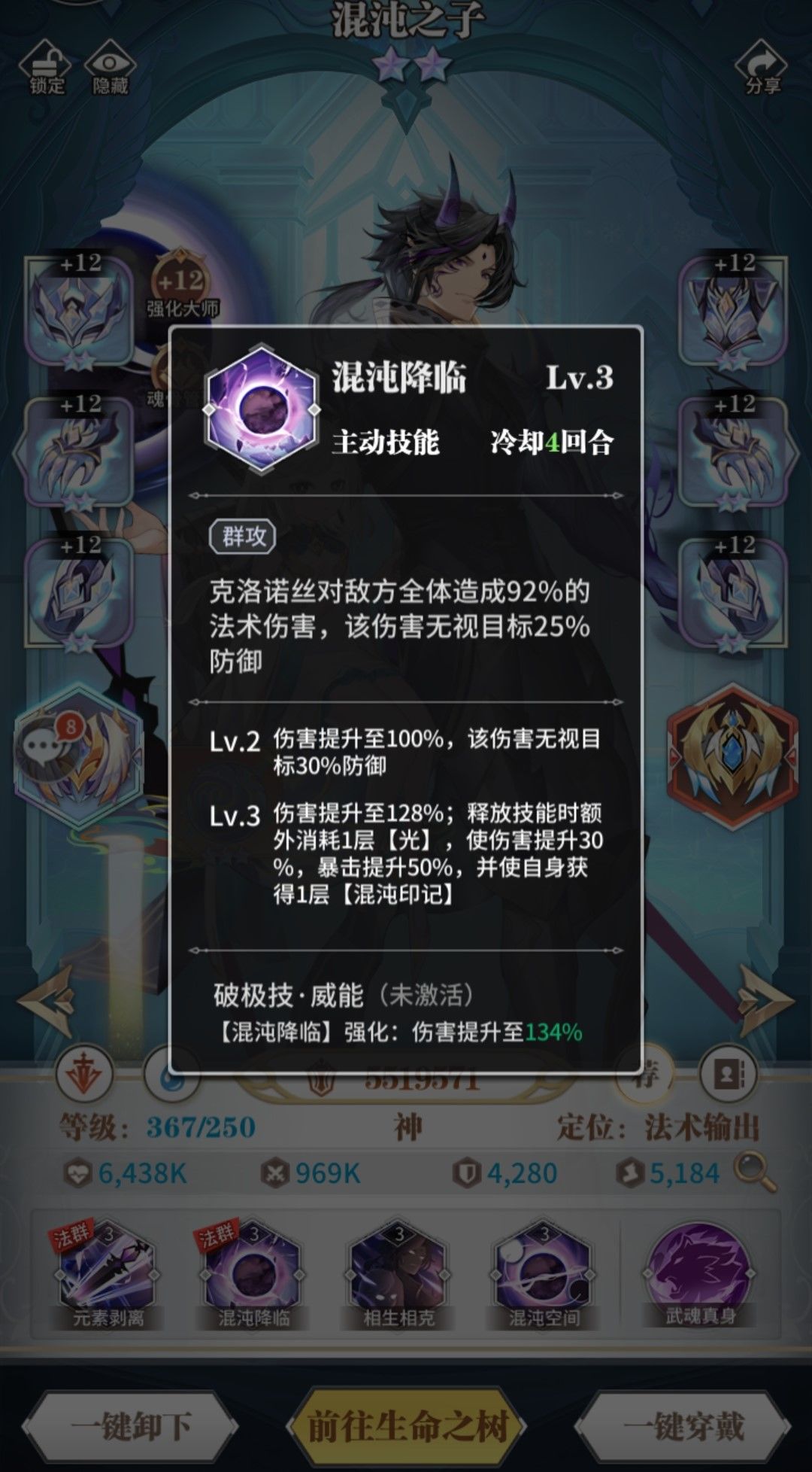 (2)二技能混沌降临,这个技能是游戏里数一数二的输出技能,伤害爆炸,不仅自带无视30%防御的被动而且三星神器后的八回合内(不被控且不带法连的情况下)释放的两次该技能都能提升30%的伤害和50%的暴击,这个技能标志着混沌之子可以不带高穿也可以不堆暴击只堆爆伤,将伤害最大化。