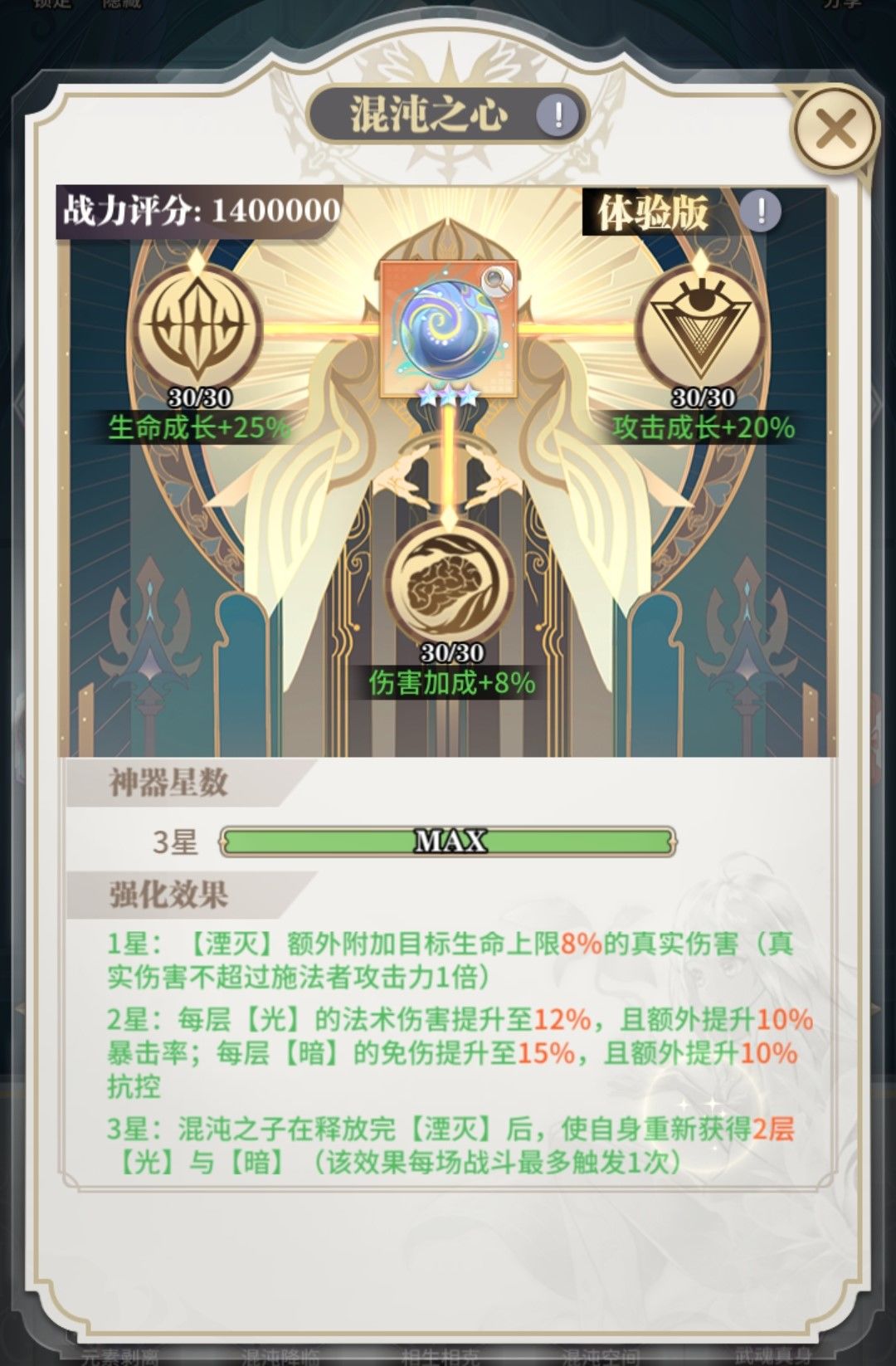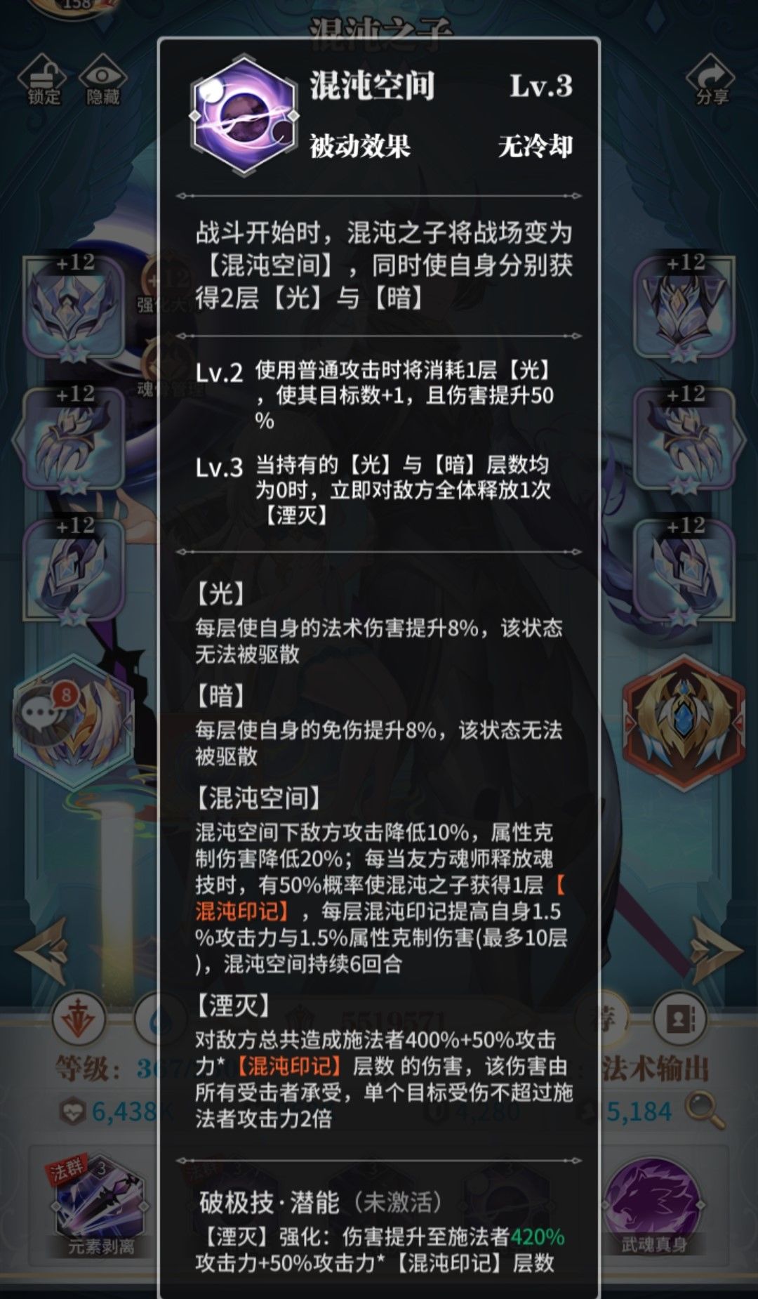 (3)四技能混沌空间,这个技能也是非常亮眼的,三星神器下开局获得四层buff,并且布置环境领域。每层光提供8%法伤,每层暗提供8%免伤(三星神器下变成12%法伤+10%暴击率,15%免伤+10%抗控)。六回合内对面全体魂师下降10%攻击力以及20%的属性克制伤害。还附加了混沌印记的累加型buff,最高可加自身15%攻击力以及15%克制伤害。除此之外还附加了个湮灭被动,提高了混沌之子的持续输出。光暗印记消耗完就可以放一次,三星神器下伤害非常可观。