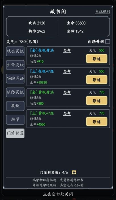 藏书阁,之前门派里提到过,学习到的功法都会在这里汇集。使用灵气提升功法等级,功法的等级和阶级越高属性值加成越高。另外消耗同名功法,可提升功法阶级。需要注意一下功法对应的五行属性,是受到对应阵眼加成的。门派秘诀有学习数量上限,到达上限之后可以选择“忘却”,100%返还修炼所消耗的功法残页,然后再学习新的秘诀。