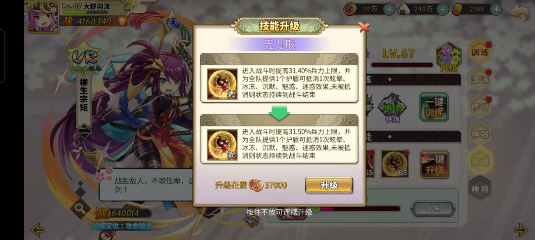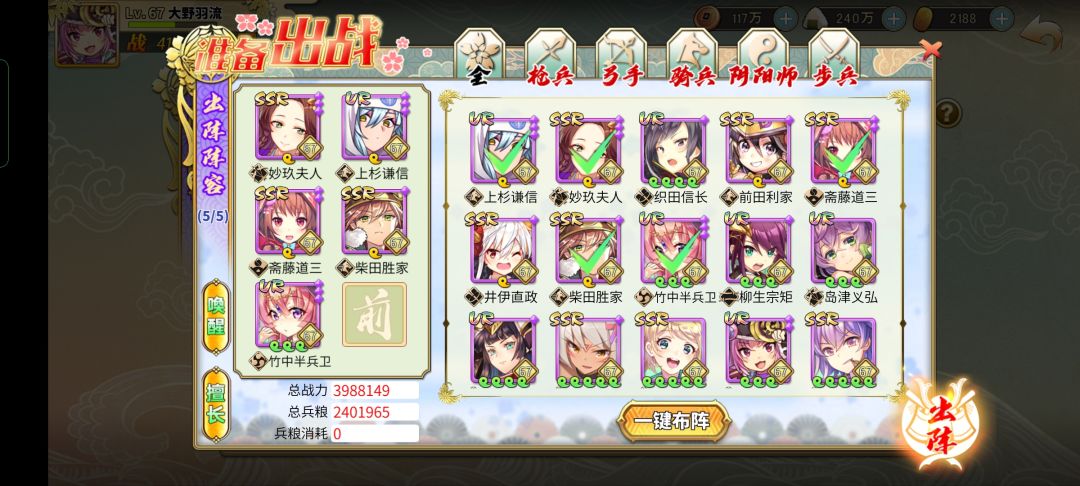 先前可扫荡的几关最好自己打过去,这样可以快速把好几队角色积满能量,不过相信大家也在征讨时遇到过对面竹中比己方先手开大的情况,这个时候只要把夫人(当你竹中充能足够的前提下也可以把柴田替换)替换成柳生即可