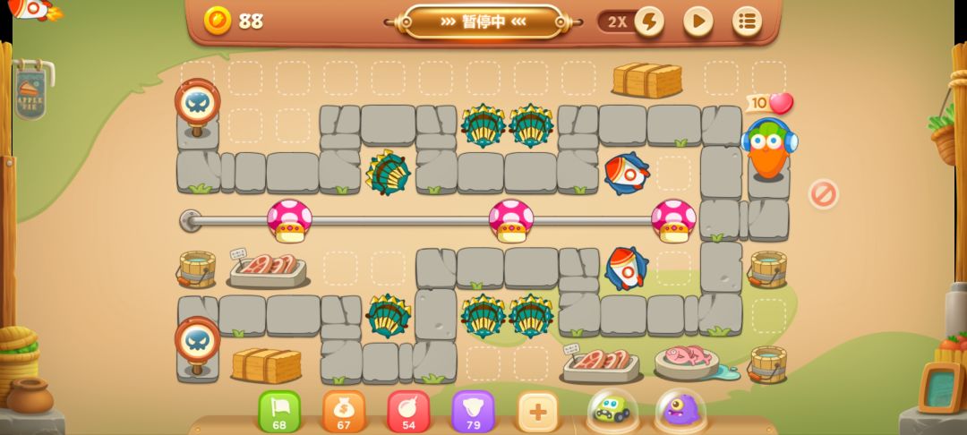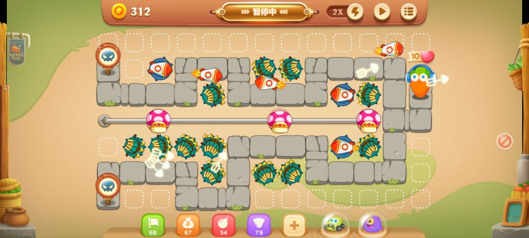 首先中间放个满级蘑菇,放两个2级弓箭,一边清理障碍物,一边注意小怪,有时候要左右拉动三个炮塔。