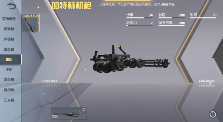 加特林机枪弹夹容量为200超大弹夹带给荒友满满安心感近距离与对手遭遇,完全不必惊慌在打空一个弹匣之前就可将其击败