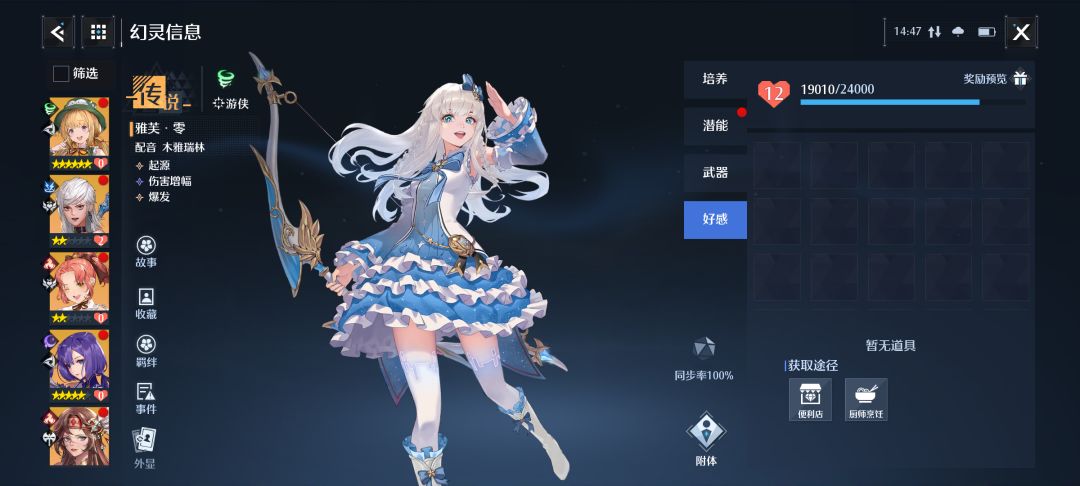 预计明天或者后天雅芙时装与称号到手,在不用钻石氪的情况下速度实在有些捉急,在我决定弄时装到今天大概半个月吧,总算看见曙光了,目前就是每天家园的烹饪全部喂雅芙,外加每天1400精力全部做300的鱼蟹烹饪,还有就是商店里的五折好感礼物,外加时空副本。还好雅芙有120%的食物,像诺亚那种只有110%的我就不弄了,等到什么时候开发出120%好感度再说。如果可以的话把每个幻灵加一个记录功能,只要送过喜欢的就记下来,下次还送,不然玩游戏还得做笔记,这样不好。