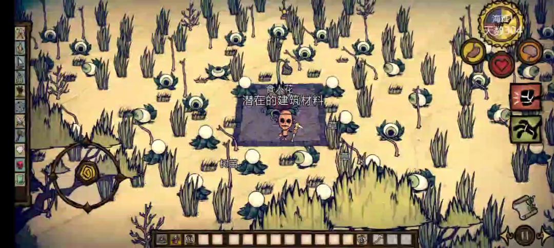 由于食人花拥有收集周围物资的能力,所以将大量草和树苗用铲子移植到食人花周围,等食人花长出眼球草收集完草和树枝之后,击杀本体就可以轻松获取全部草和树枝。省去了一个个采集的麻烦。