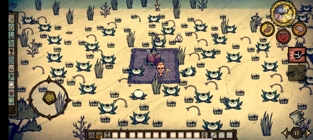 完成以上操作,食人花农场就算完成了。后续只需要隔一段时间来打爆食人花拿物资就好,食人花会自动堆叠草和树枝。所以收集起来非常轻松。眼球草的伤害是20,血量为30,用长矛及更强的武器就可以一下消灭。