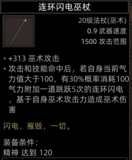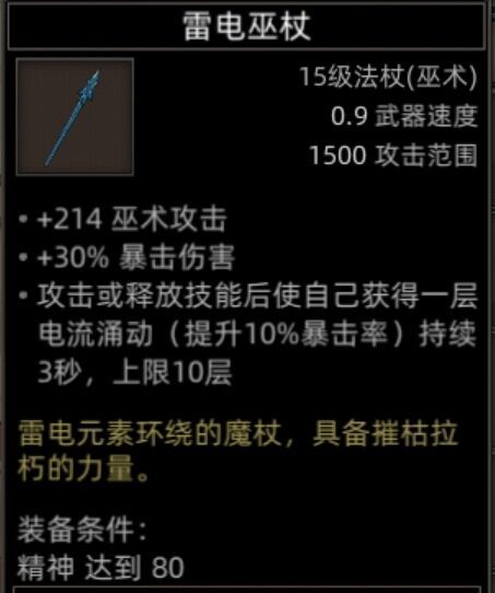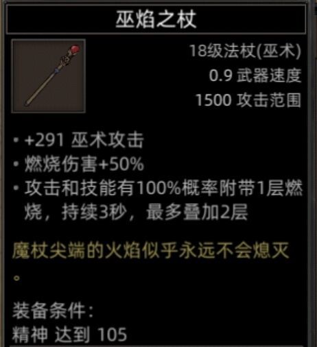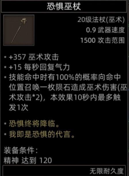 扭曲塔出的恐惧巫杖是目前输出最厉害的法杖,357之高的巫术值加成,而且还有10秒一次的2倍巫术值伤害的陨石,这就相当于直接上了一个高倍率的技能。