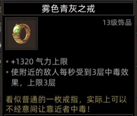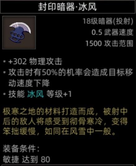 暗器中的极品,不低的攻击加成,攻击50%概率的减移速,再加上15秒cd持续15秒debuff的攻速移速双减。