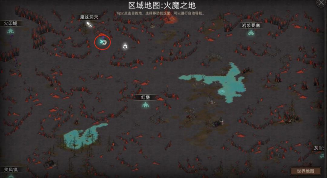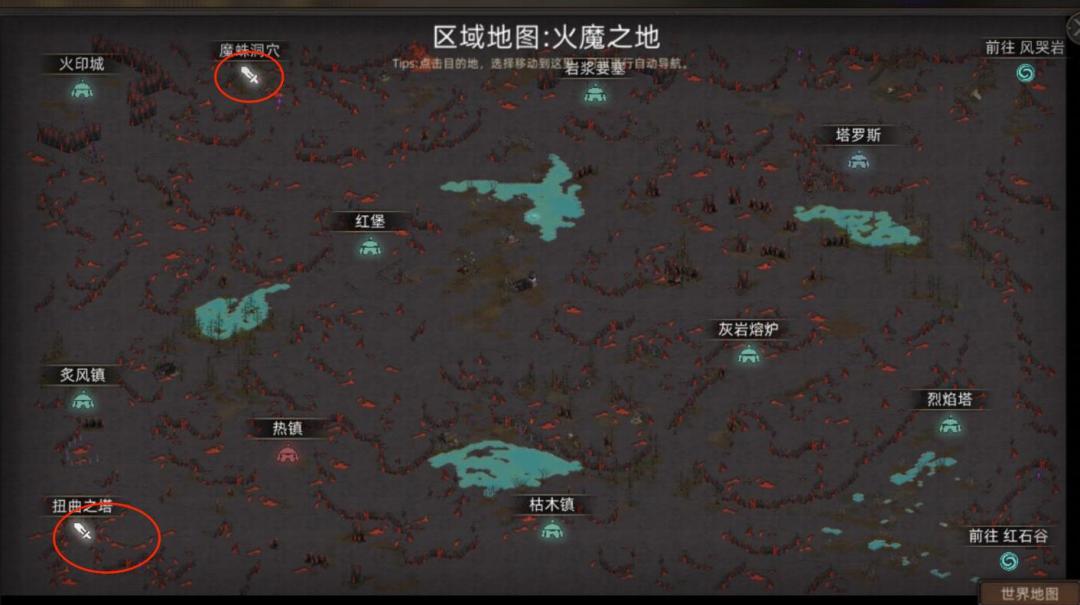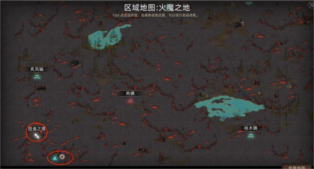 扭曲塔位于火魔地图左下角,只能通过地图上的三个传送门进入,地图右下角、右上角、左上角都有一个魔界传送门。